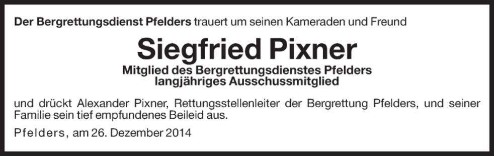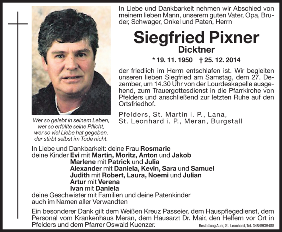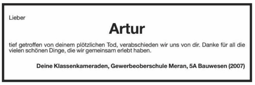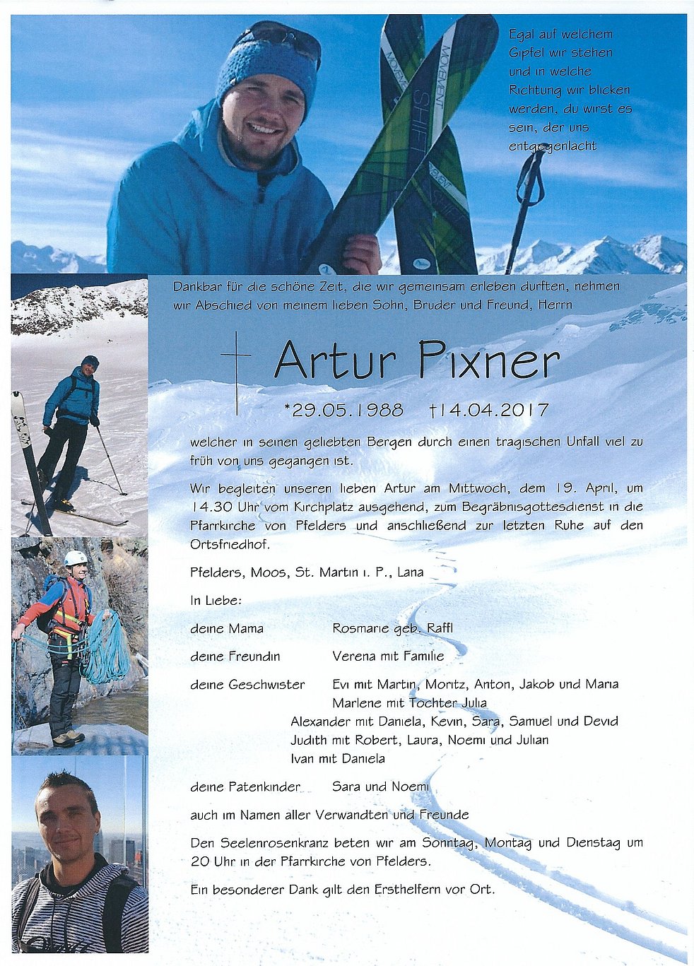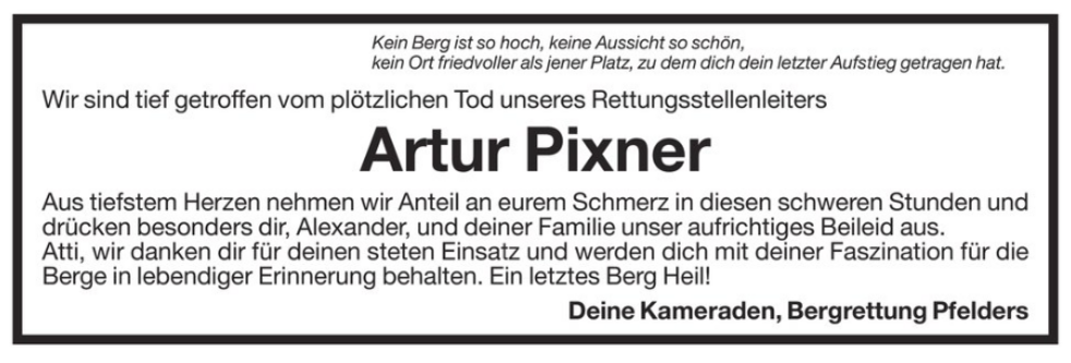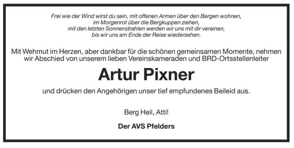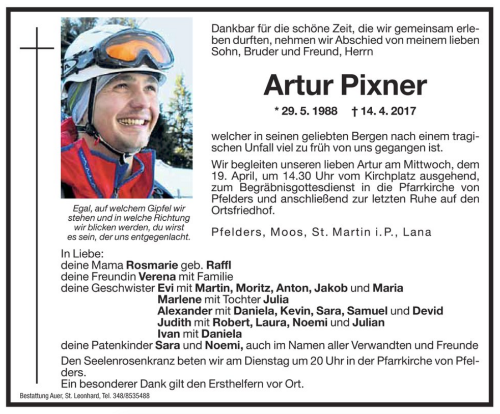 Wir begleiten unseren lieben Artur am Mittwoch, dem 19. April, um 14.30 Uhr vom Kirchplatz ausgehend, zum Begräbnisgottesdienst in die Pfarrkirche von Pfelders und anschließend zur letzten Ruhe auf den Ortsfriedhof.