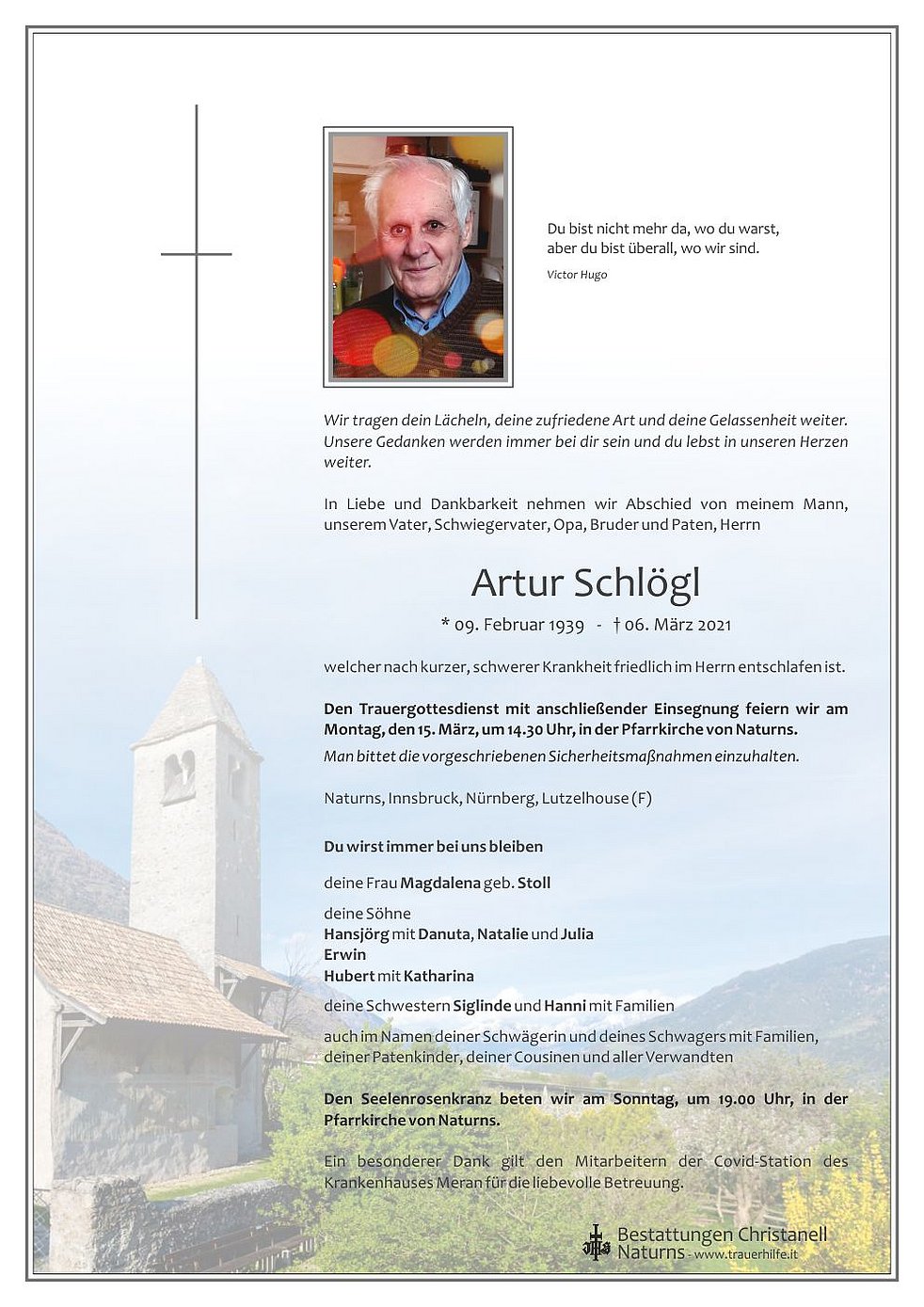 Den Trauergottesdienst mit anschließender Einsegnung feiern wir am Montag, den 15. März, um 14.30 Uhr, in der Pfarrkirche von Naturns.