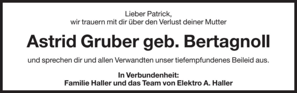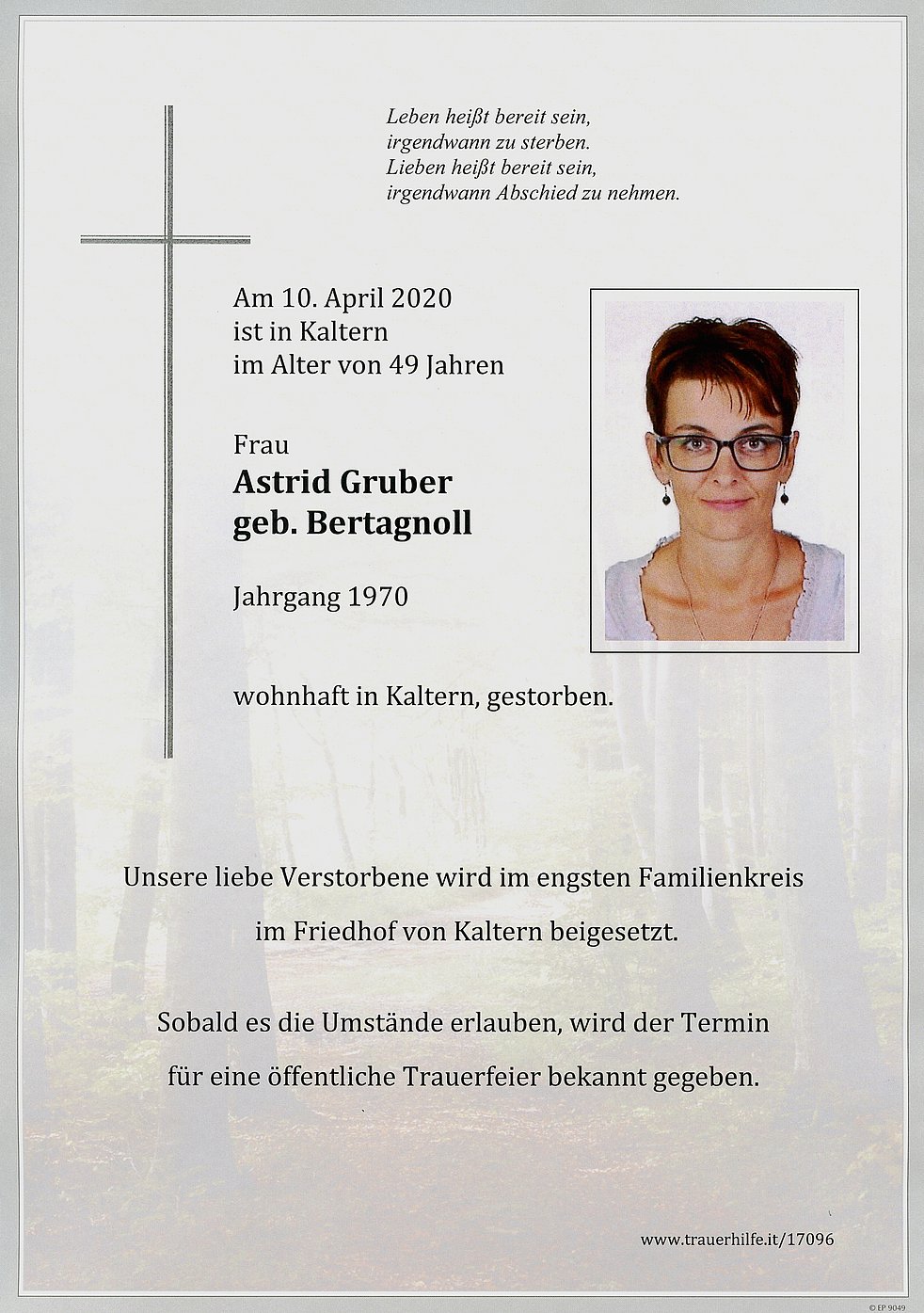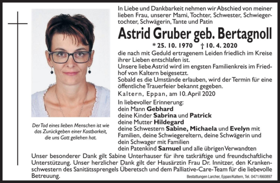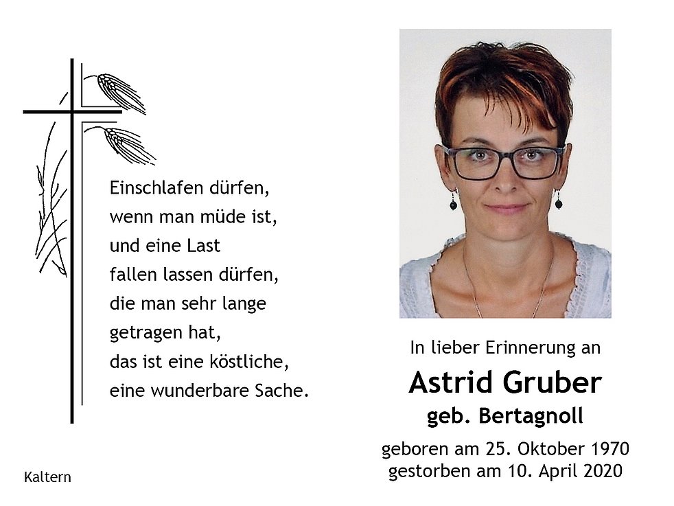 Unsere liebe Astrid wird im engsten Familienkreis im Friedhof von Kaltern beigesetzt.