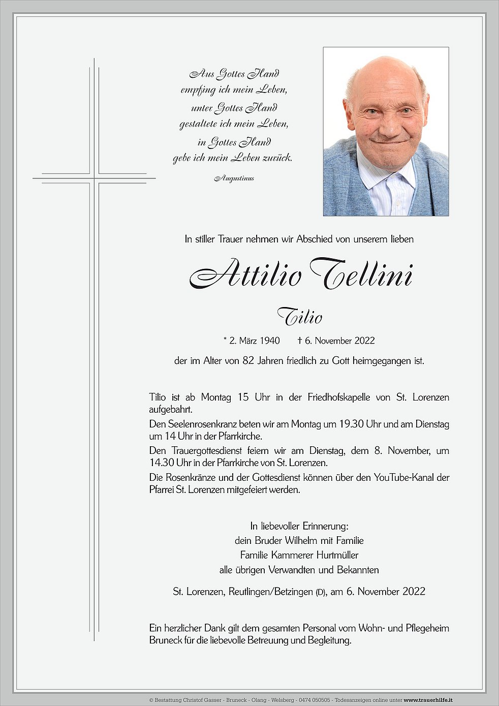 Den Trauergottesdienst feiern wir am Dienstag, dem 8. November, um 14.30 Uhr in der Pfarrkirche von St. Lorenzen.