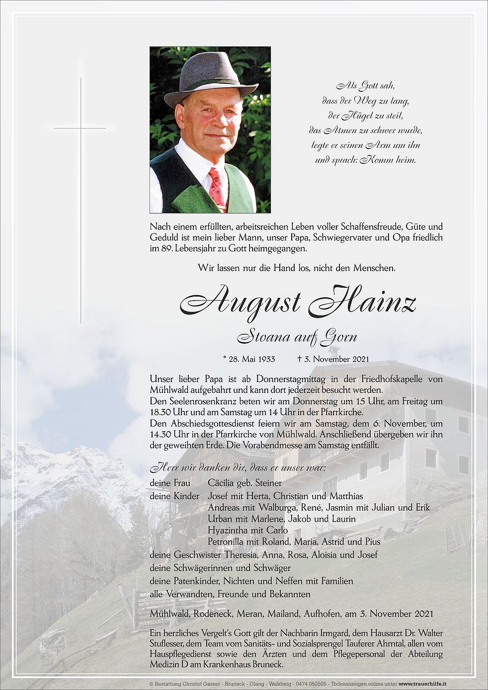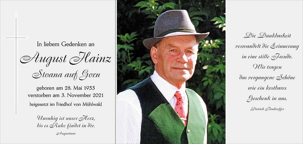Den Abschiedsgottesdienst feiern wir am Samstag, dem 6. November, um 14.30 Uhr in der Pfarrkirche von Mühlwald. Anschließend übergeben wir ihn der geweihten Erde. Die Vorabendmesse am Samstag entfällt.