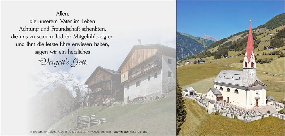 Ein herzliches Vergelt’s Gott gilt der Nachbarin Irmgard, dem Hausarzt Dr. Walter Stuflesser, dem Team vom Sanitäts- und Sozialsprengel Tauferer Ahrntal, allen vom Hauspflegedienst sowie den Ärzten und dem Pflegepersonal der Abteilung Medizin D am Krankenhaus Bruneck.