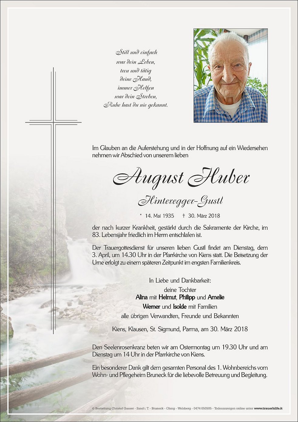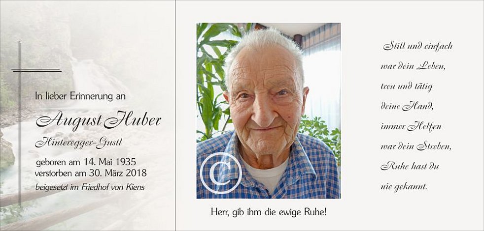 Der Trauergottesdienst für unseren lieben Gustl findet am Dienstag, dem 3. April, um 14.30 Uhr in der Pfarrkirche von Kiens statt. Die Beisetzung der Urne erfolgt zu einem späteren Zeitpunkt im engsten Familienkreis.