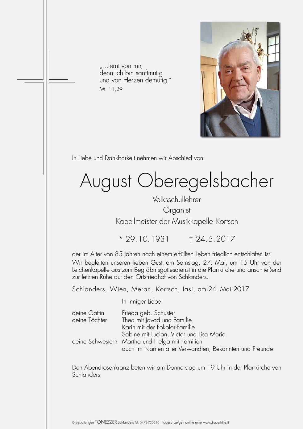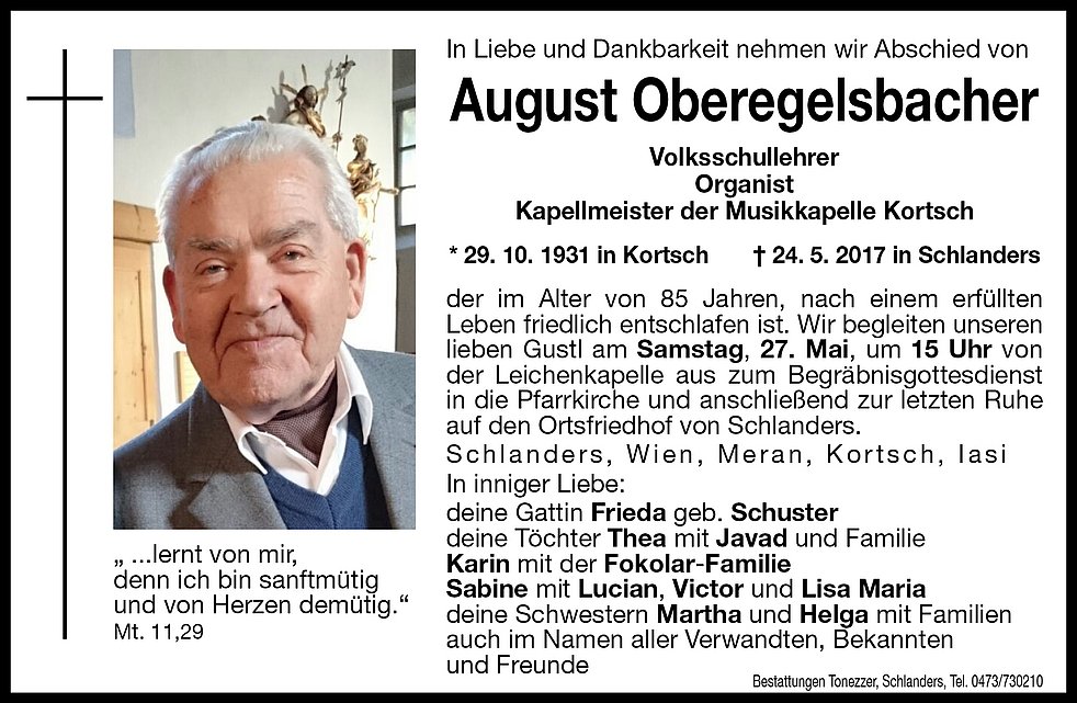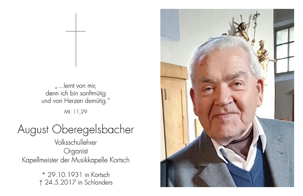 Wir begleiten unseren lieben Gustl am Samstag, 27. Mai, um 15 Uhr von der Leichenkapelle aus zum Begräbnisgottesdienst in die Pfarrkirche und anschließend zur letzten Ruhe auf den Ortsfriedhof von Schlanders.