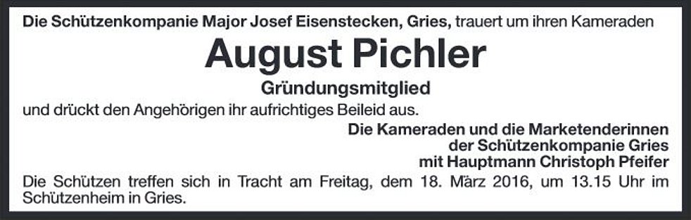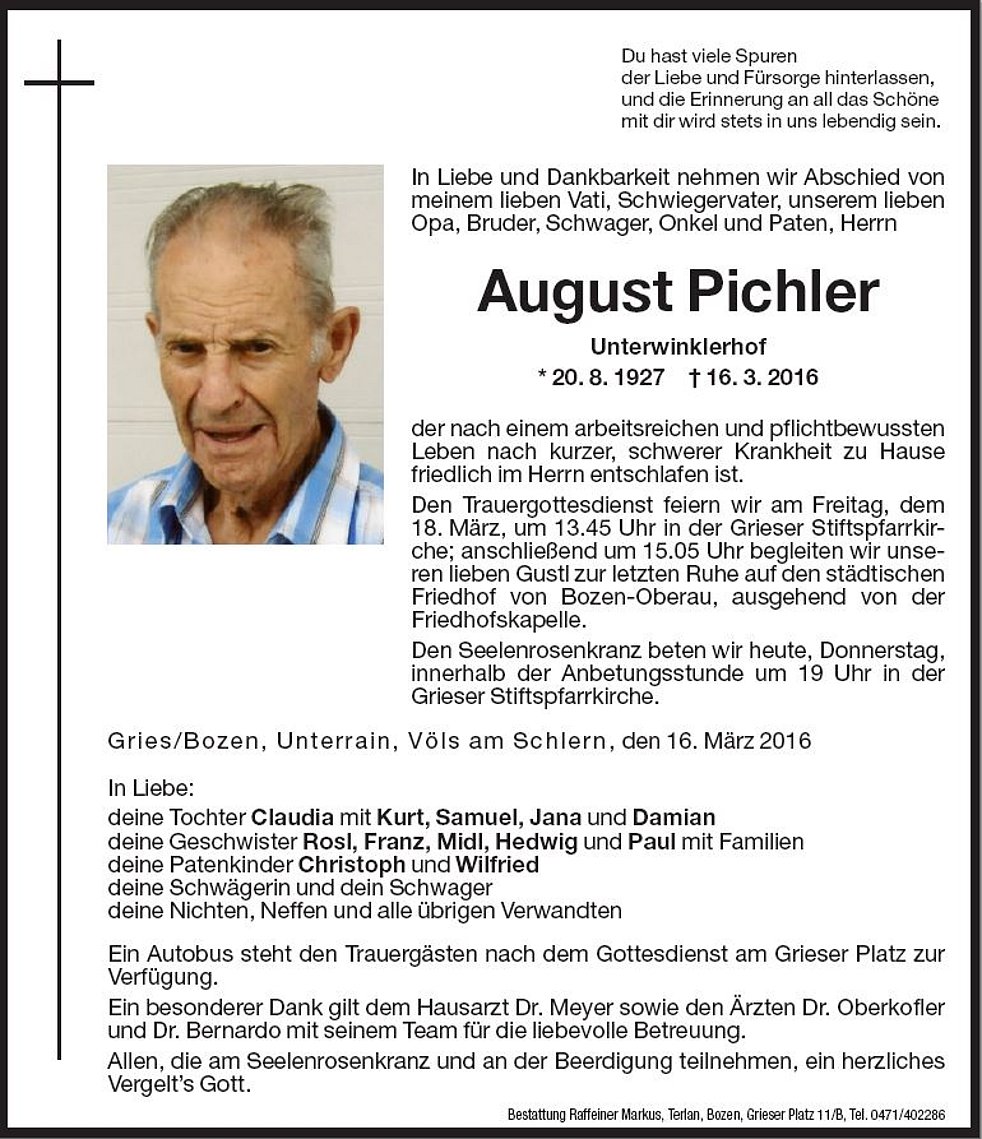 Den Trauergottesdienst feiern wir am Freitag, den 18. März, um 13.45 Uhr in der Grieser Stiftspfarrkirche; anschlieβend um 15.05 Uhr begleiten wir unseren lieben Gustl zur letzten Ruhe auf den städtischen Friedhof von Bozen-Oberau, ausgehend von der Friedhofskapelle.
