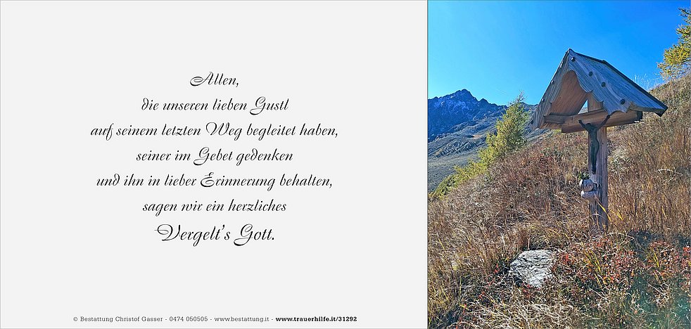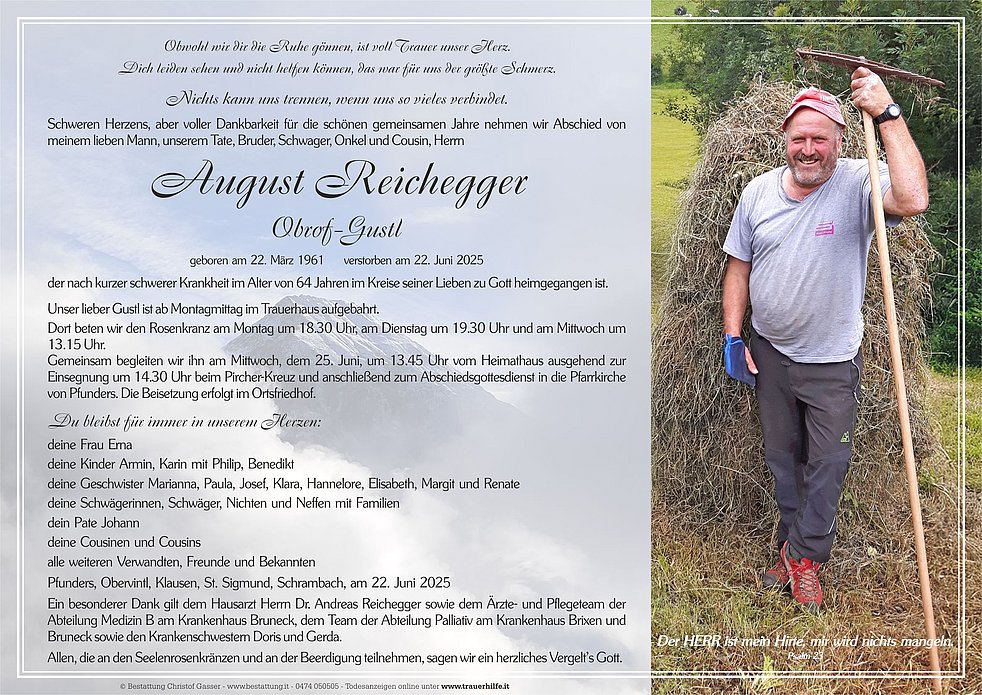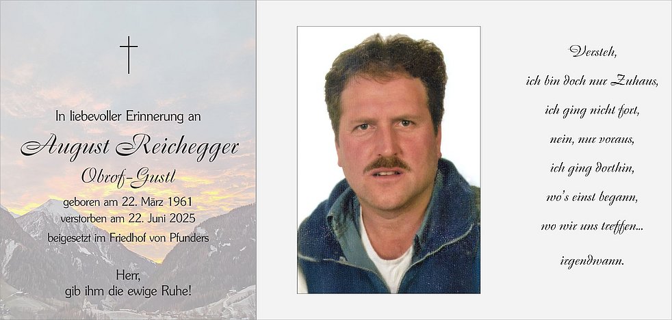 Gemeinsam begleiten wir ihn am Mittwoch, dem 25. Juni, um 13.45 Uhr vom Heimathaus ausgehend zur Einsegnung um 14.30 Uhr beim Pircher-Kreuz und anschließend zum Abschiedsgottesdienst in die Pfarrkirche von Pfunders. Die Beisetzung erfolgt im Ortsfriedhof.