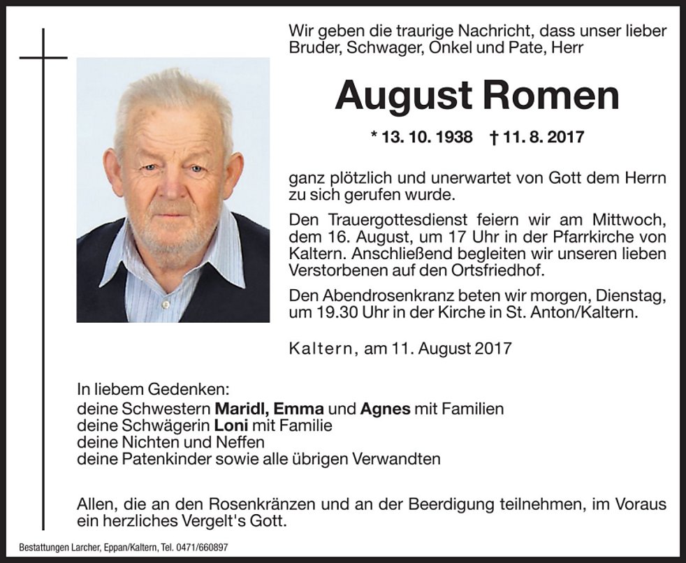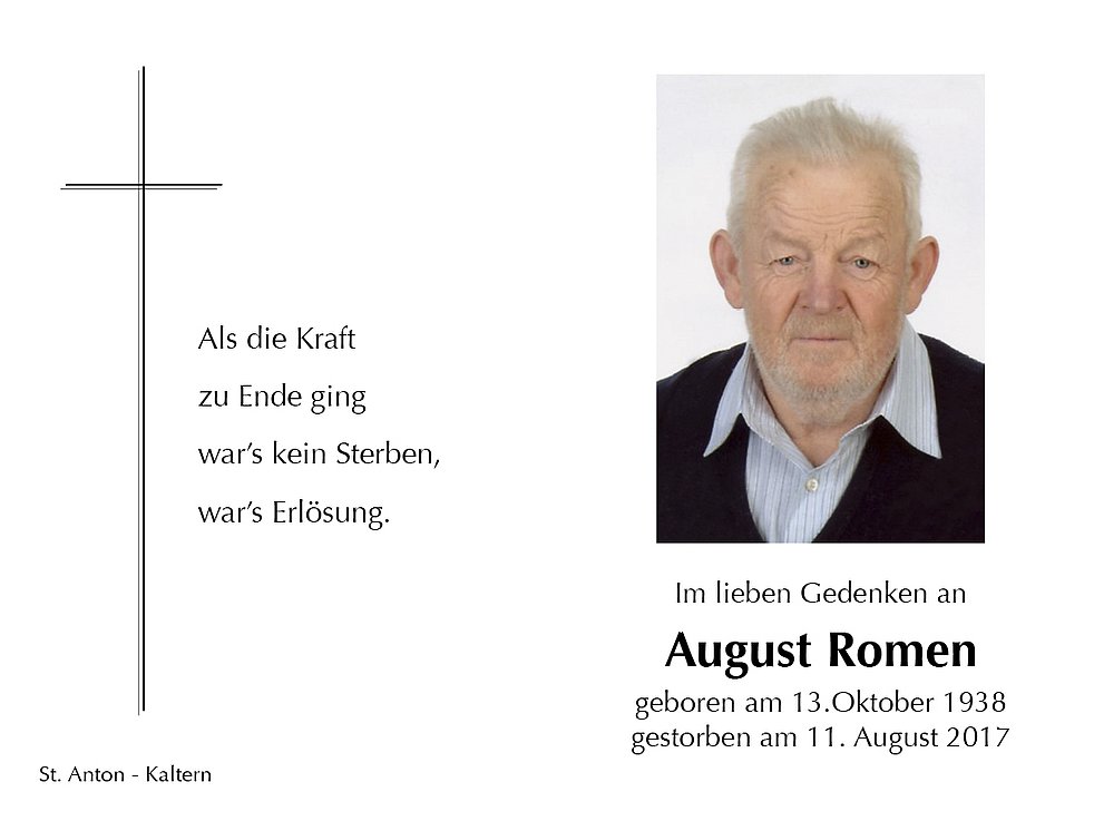 Den Trauergottesdienst feiern wir am Mittwoch, dem 16. August um 17 Uhr in der Pfarrkirche von Kaltern. Anschließend begleiten wir unseren lieben Verstorbenen auf den Ortsfriedhof.
