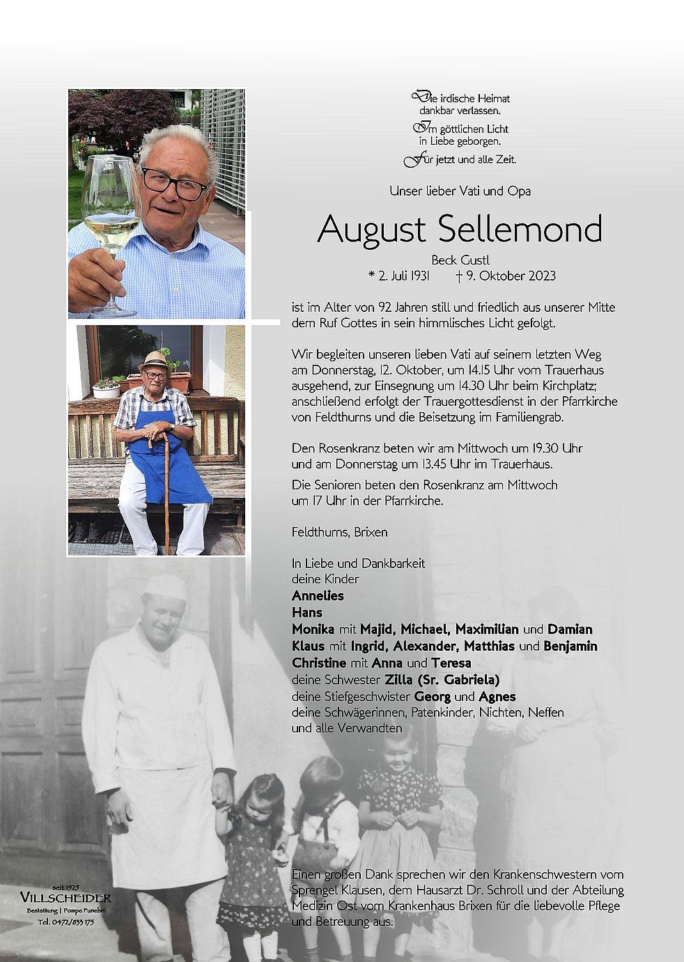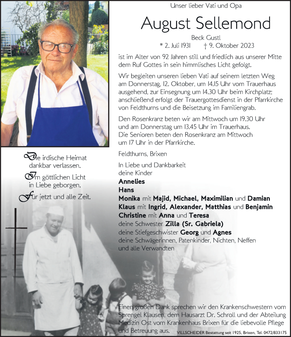 du hosch Feldthurns viele Johr long mit an gonz guatn Brot versorgt, vergelt's Gott! Ruhe iatz in Friedn.