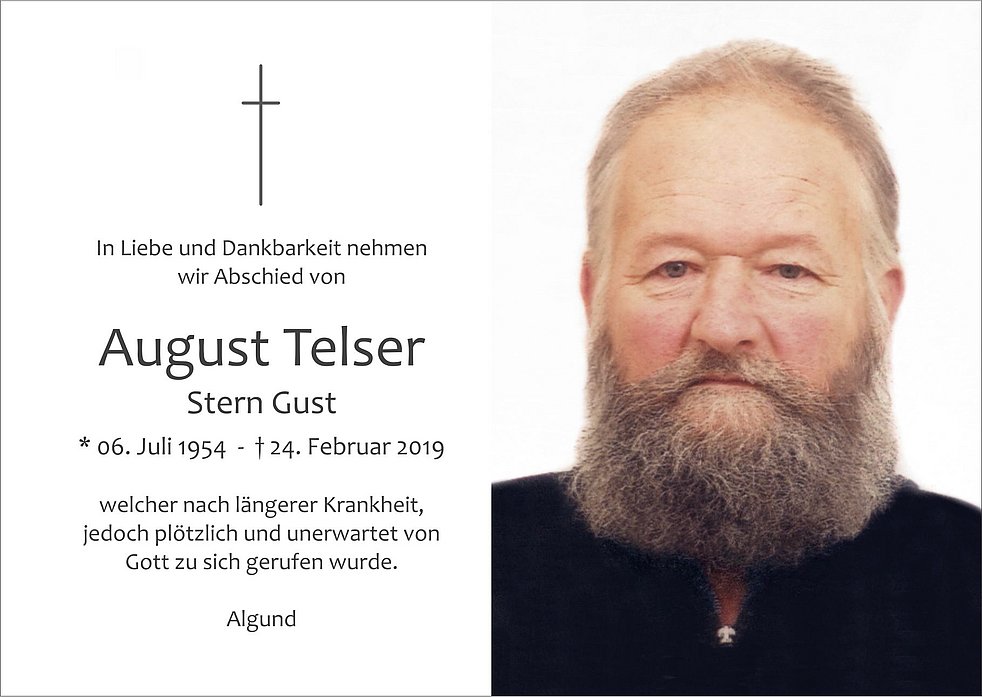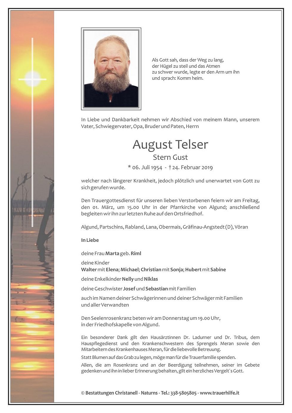 Den Trauergottesdienst für unseren lieben Verstorbenen feiern wir am Freitag, den 01. März, um 15.00 Uhr in der Pfarrkirche von Algund; anschließend begleiten wir ihn zur letzten Ruhe auf den Ortsfriedhof.
