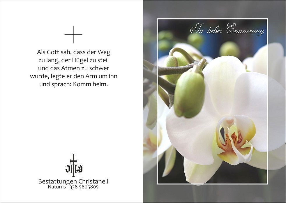 Ein besonderer Dank gilt den Hausärztinnen Dr. Ladurner und Dr. Tribus, dem Hauspflegedienst und den Krankenschwestern des Sprengels Meran sowie den Mitarbeitern des Krankenhauses Meran, für die liebevolle Betreuung.