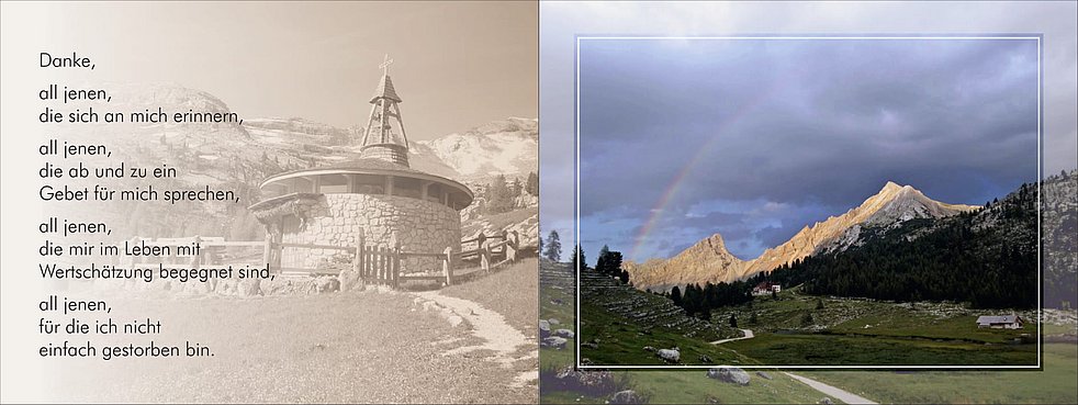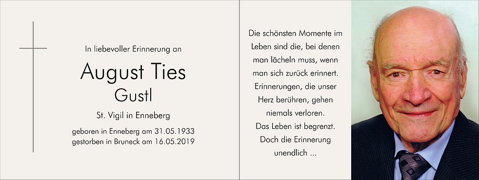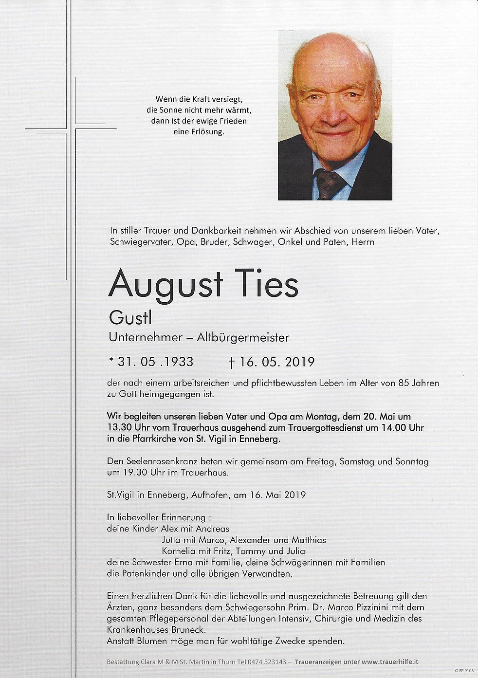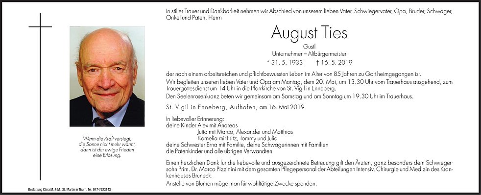 Wir begleiten unseren lieben Vater und Opa am Montag, dem 20. Mai um 13.30 Uhr vom Trauerhaus ausgehend zum Trauergottesdienst um 14.00 Uhr in die Pfarrkirche von St. Vigil in Enneberg.