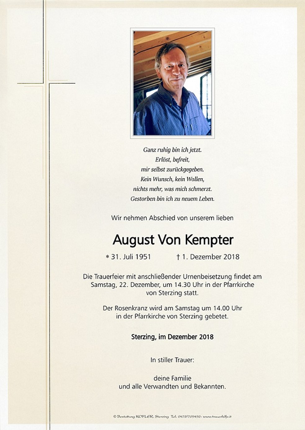 Die Trauerfeier mit anschließender Urnenbeisetzung findet am Samstag, 22. Dezember, um 14.30 Uhr in der Pfarrkirche von Sterzing statt.