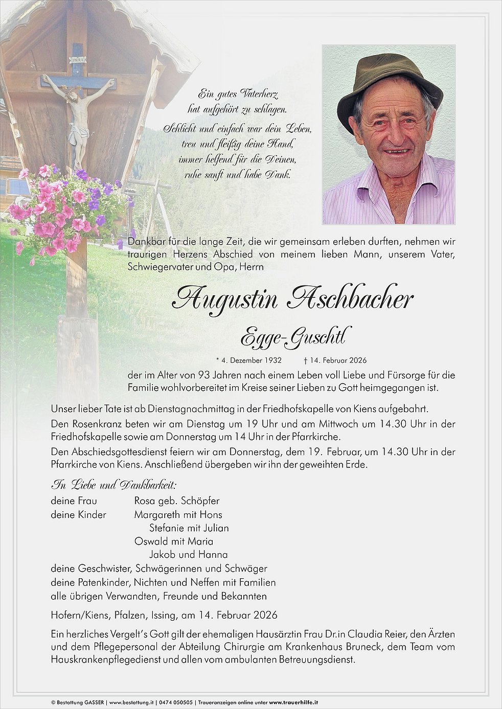 Den Abschiedsgottesdienst feiern wir am Donnerstag, dem 19. Februar, um 14.30 Uhr in der Pfarrkirche von Kiens. Anschließend übergeben wir ihn der geweihten Erde.