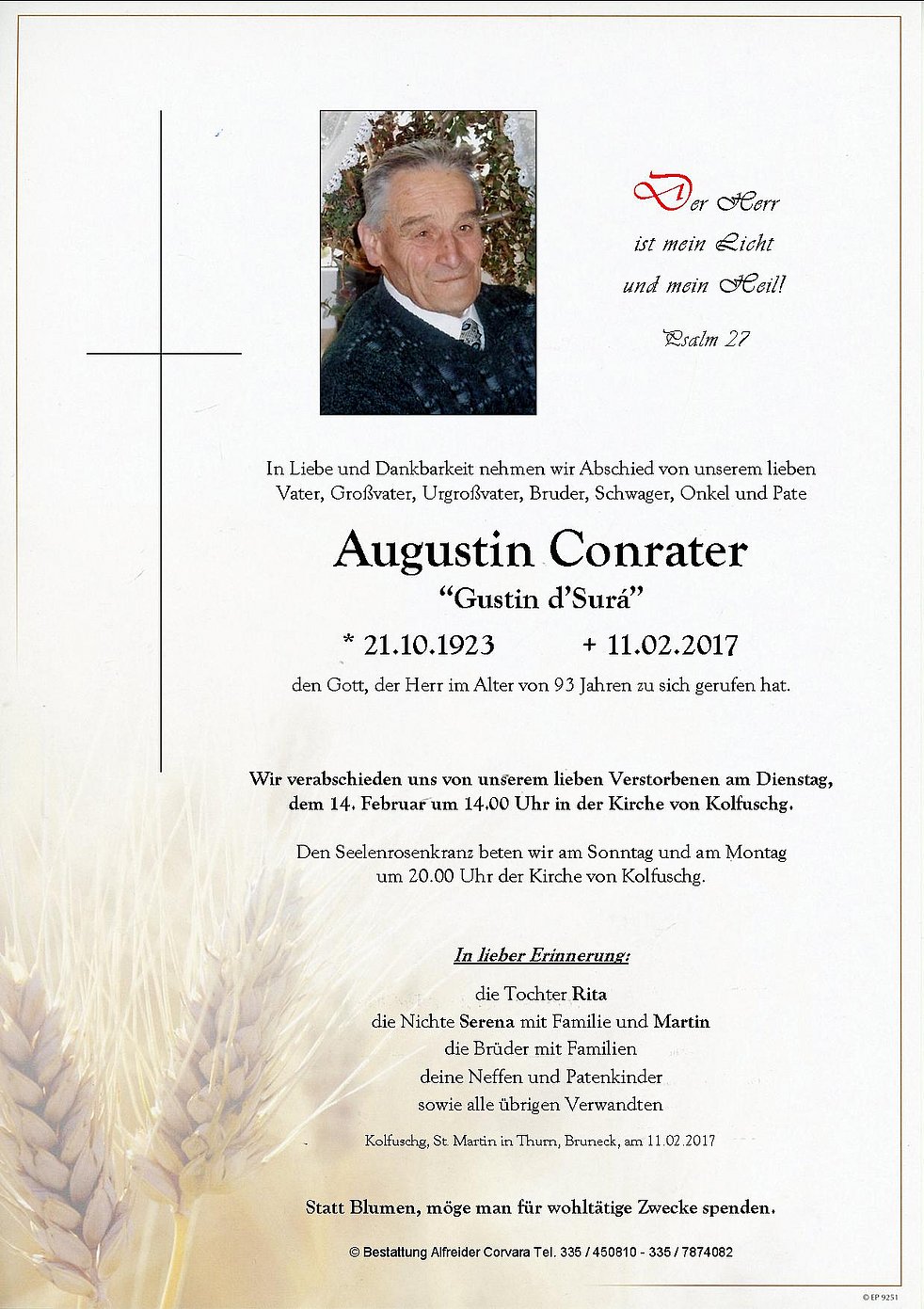Wir verabschieden uns von unserem lieben Verstorbenen am Dienstag, dem 14. Februar um 14.00 Uhr in der Pfarrkirche von Kolfuschg.
