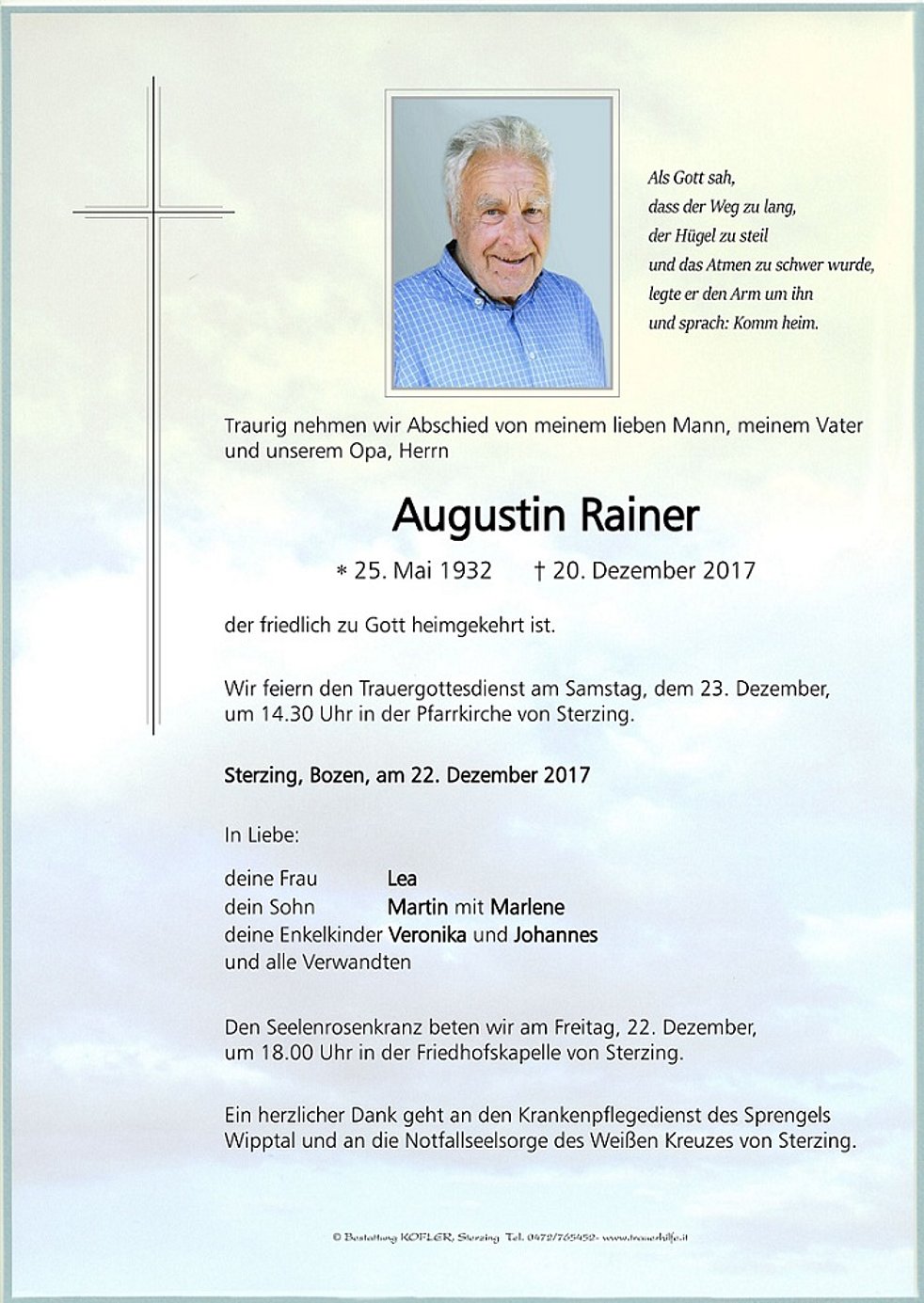 Wir feiern den Trauergottesdienst am Samstag, dem 23. Dezember, um 14.30 Uhr in der Pfarrkirche von Sterzing.