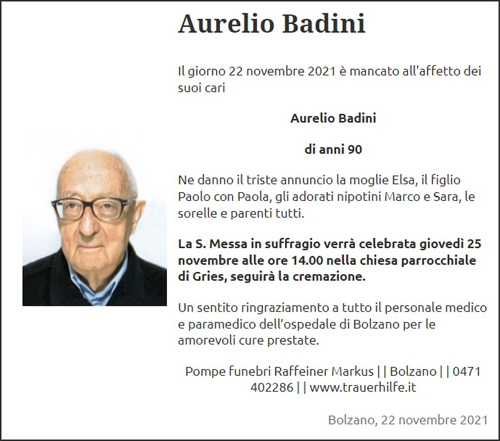 La S. Messa in suffragio verrà celebrata giovedì 25 novembre alle ore 14.00 nella la chiesa parrocchiale di Gries, seguirà la cremazione.
