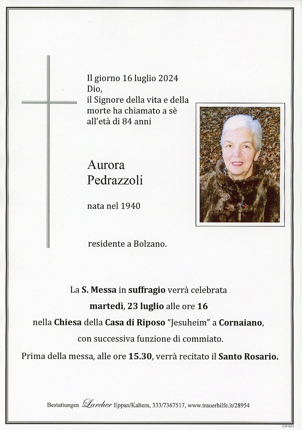 La Santa Messa in suffragio verrà celebrata martedì 23 luglio alle ore 16 nella Chiesa della Casa di Riposo "Jesuheim" a Cornaiano con successiva funzione di commiato.