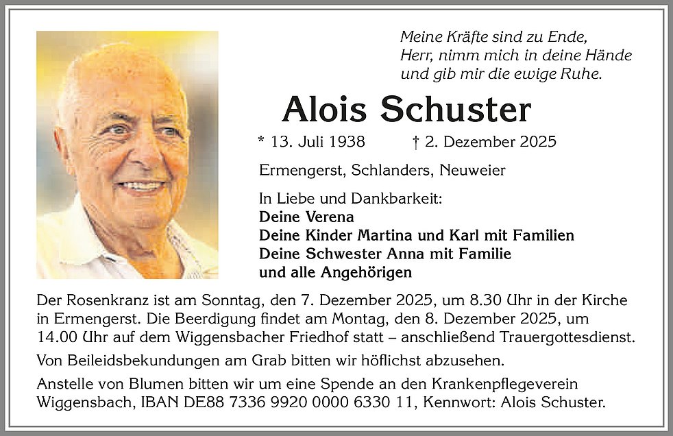 Anstelle von Blumen bitten wir um eine Spende an den Krankenpflegeverein Wiggensbach, IBAN DE88 7336 9920 0000 6330 11, Kennwort: Alois Schuster.