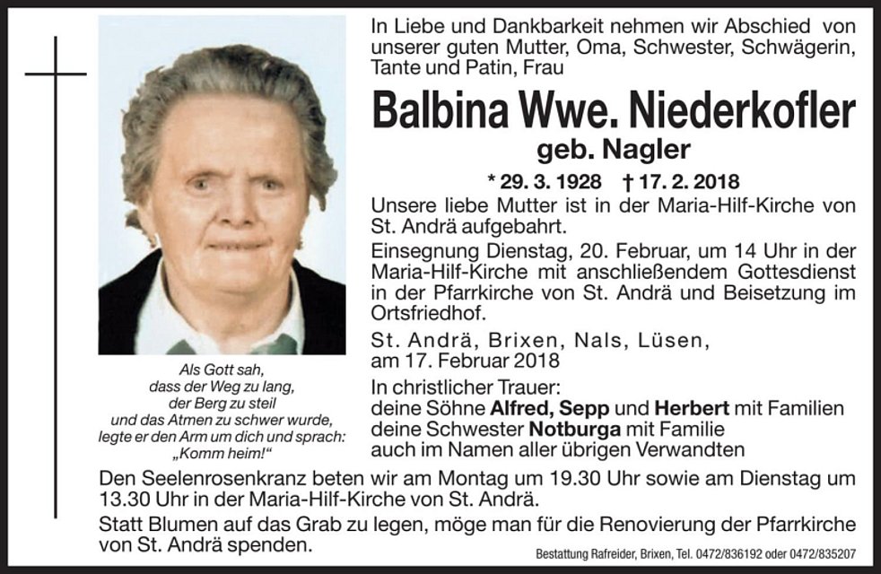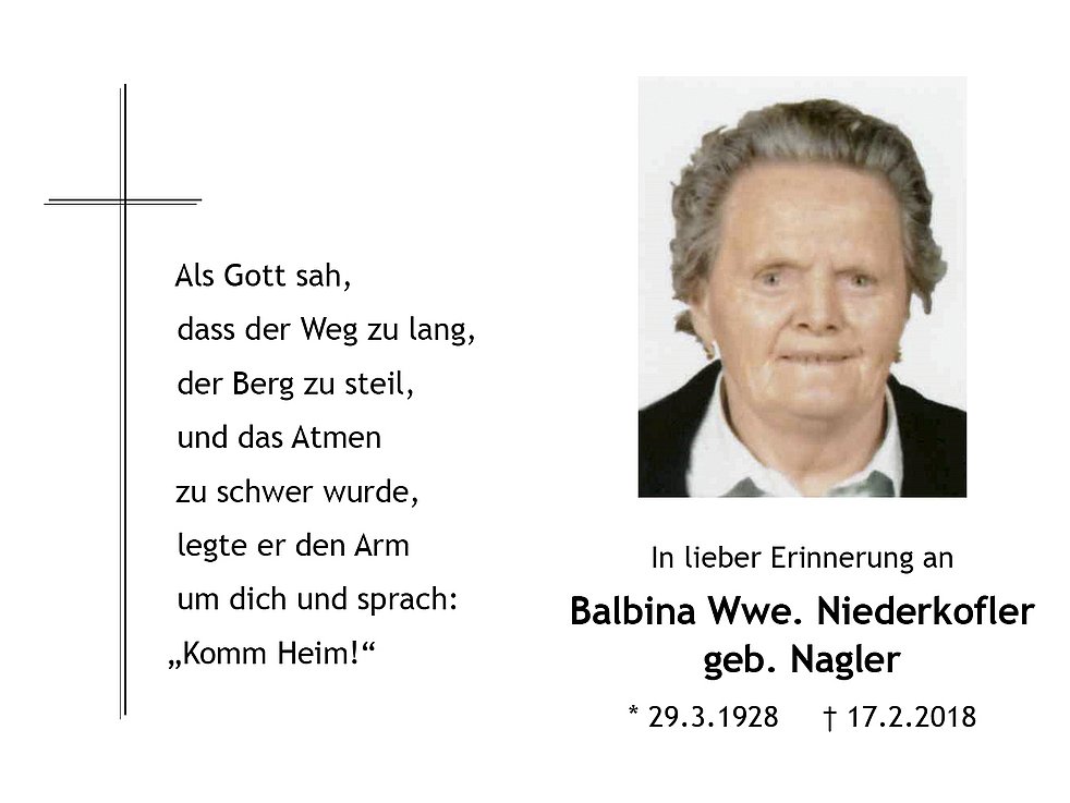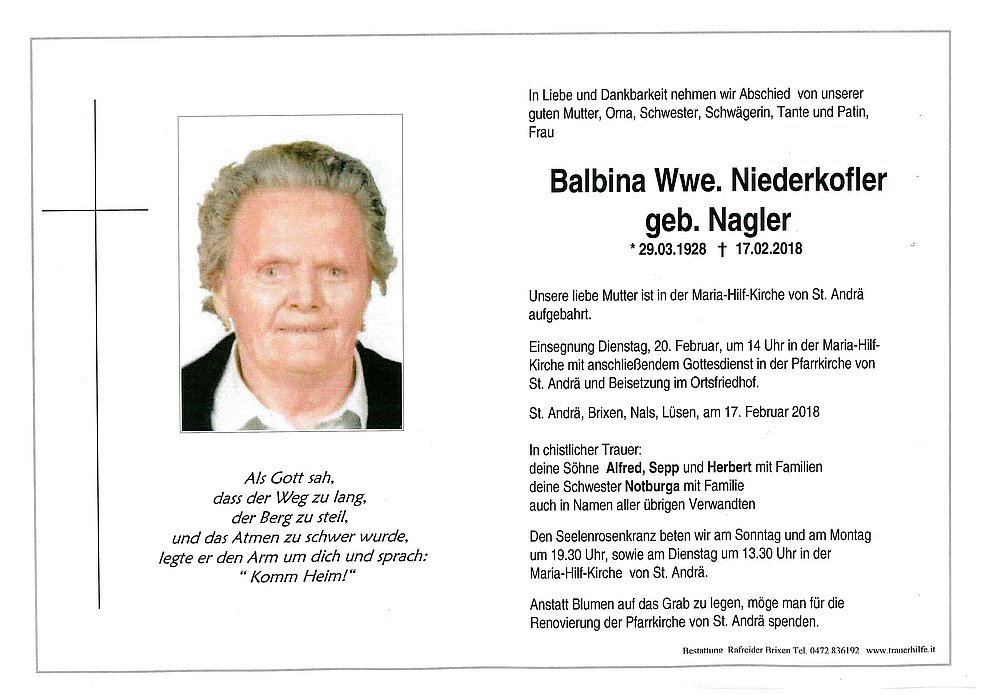 Einsegnung Dienstag, 20. Februar, um 14 Uhr in der Maria-Hilf-Kirche mit anschließendem Gottesdienst in der Pfarrkirche von St. Andrä und Beisetzung im Ortsfriedhof.