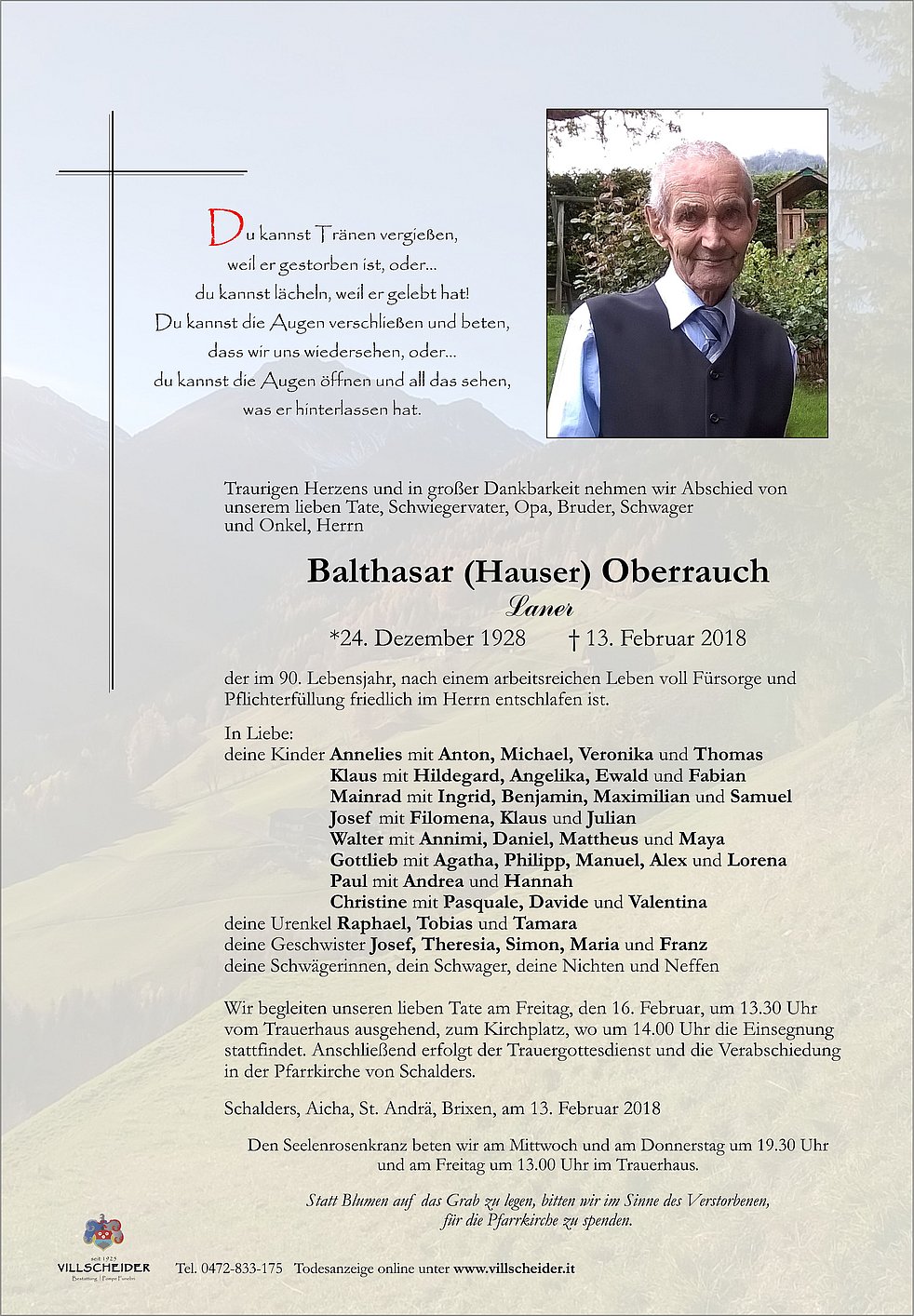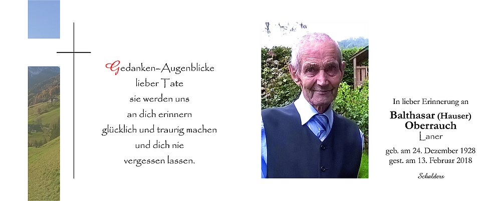 Wir begleiten unseren lieben Tate am Freitag, den 16. Februar, um 13.30 Uhr vom Trauerhaus ausgehend, zum Kirchplatz, wo um 14.00 Uhr die Einsegnung stattfindet. Anschließend erfolgt der Trauergottesdienst und die Verabschiedung in der Pfarrkirche von Schalders.