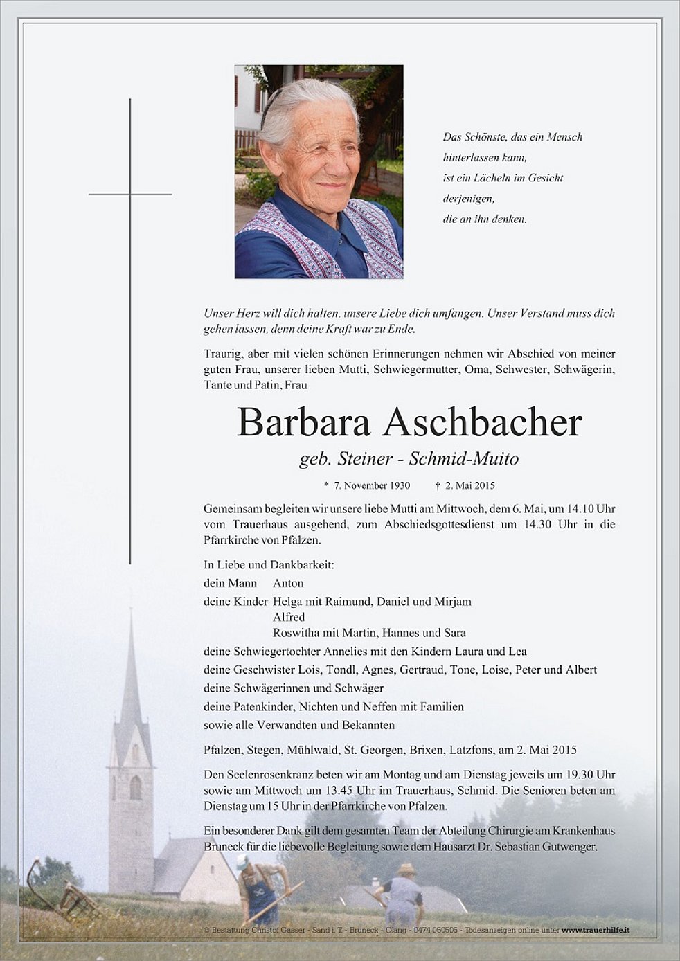 Gemeinsam begleiten wir unsere liebe Mutti am Mittwoch, dem 6. Mai, um 14.10 Uhr vom Trauerhaus ausgehend, zum Abschiedsgottesdienst um 14.30 Uhr in die Pfarrkirche von Pfalzen.