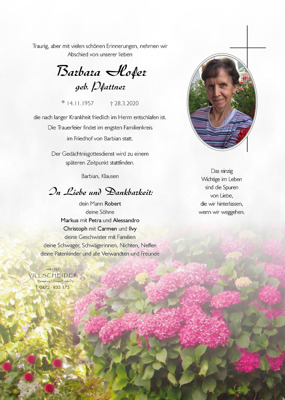 Trösten wir uns damit, dass der Glaube uns ein Wiedersehen im Himmel verspricht und dass das Leiden deiner Schwester Barbara ein Ende gefunden hat. Sie möge ruhen in Frieden.