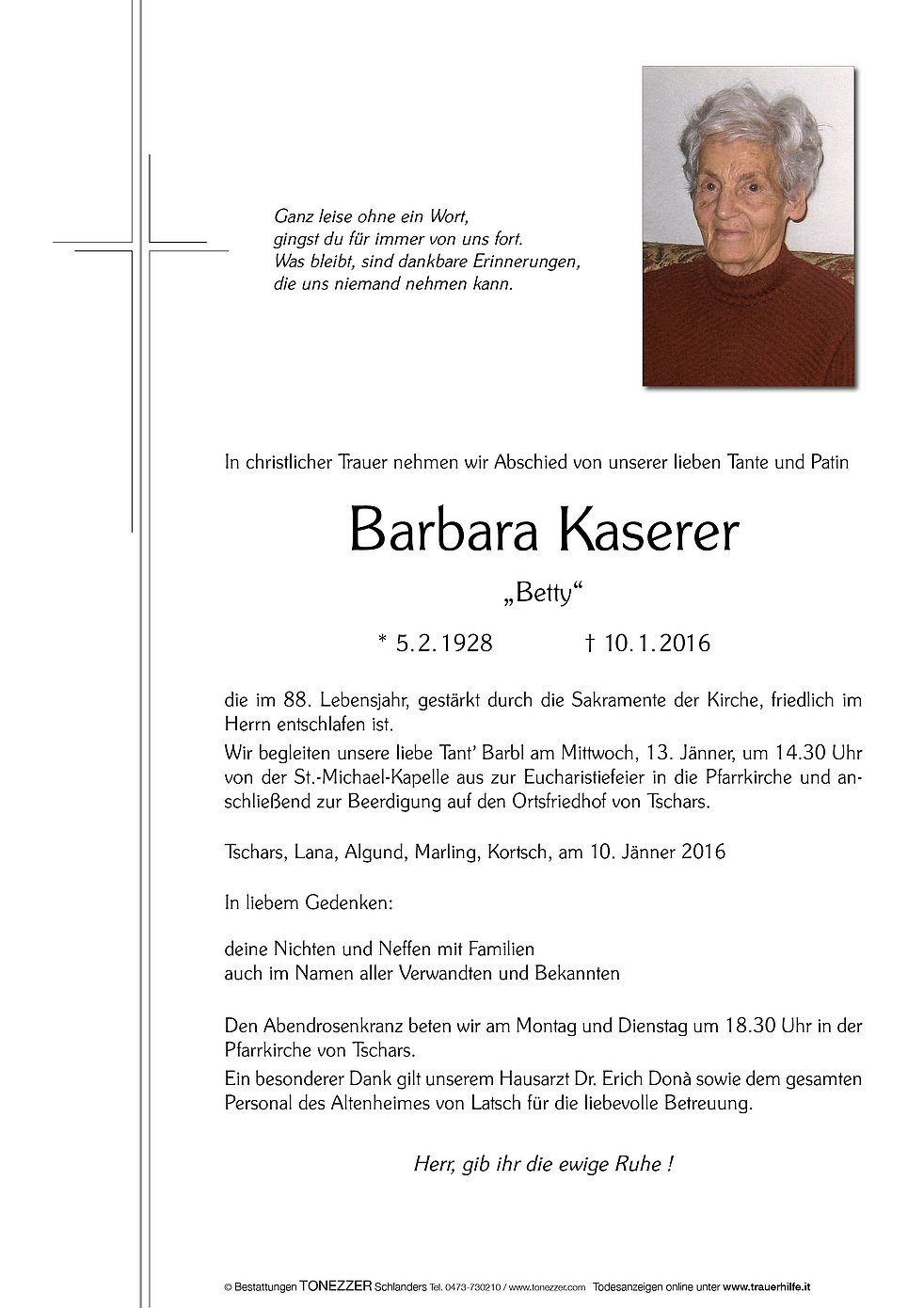 Wir begleiten unsere liebe Tant’ Barbl am Mittwoch, 13. Jänner, um 14.30 Uhr von der St.-Michael-Kapelle aus zur Eucharistiefeier in die Pfarrkirche und anschließend zur Beerdigung auf den Ortsfriedhof von Tschars.