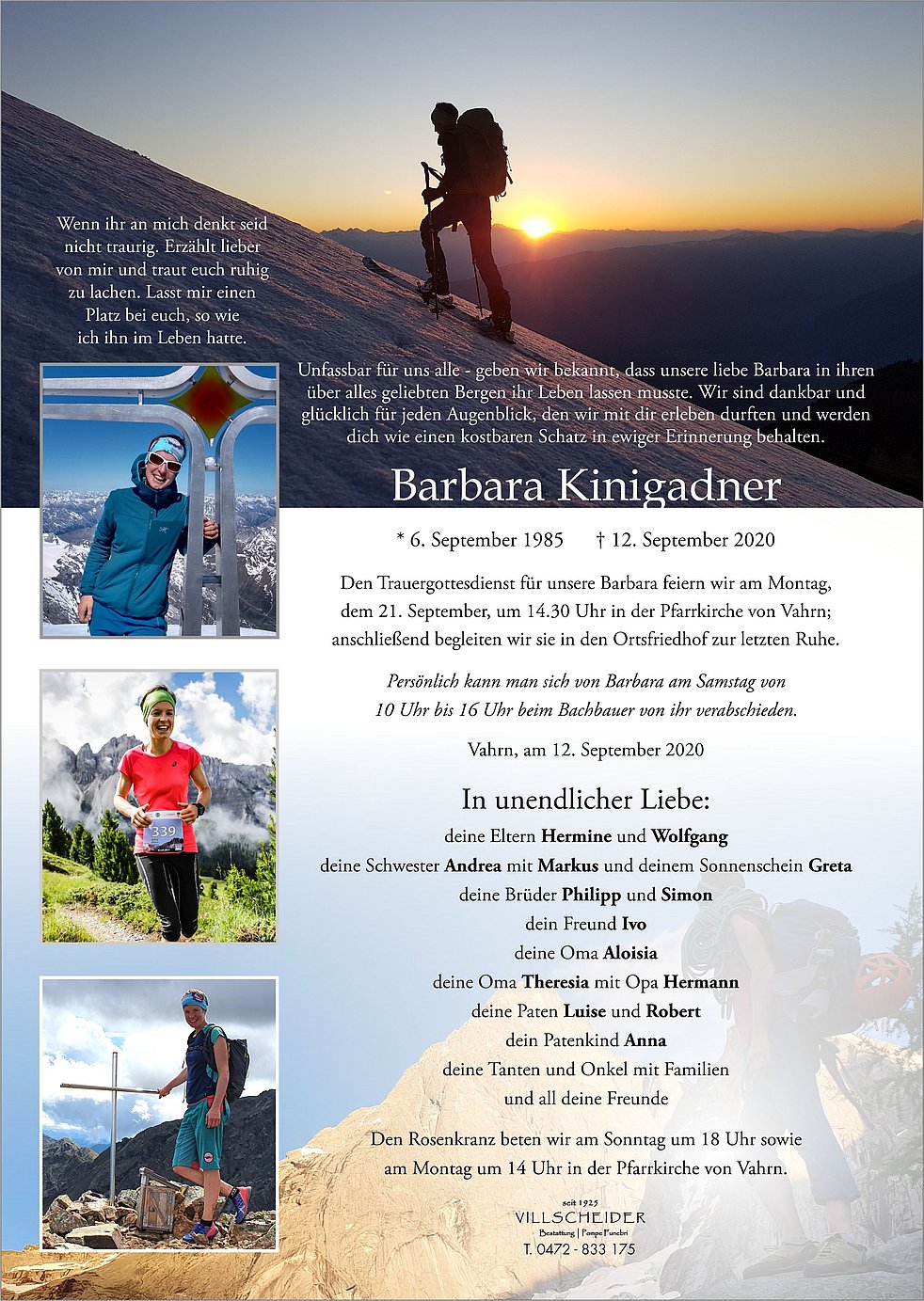 Liebe Barbara, 2 Jahre sind schon vergangen seit deinem tragischen Bergunfall. Unsere Trauer wandelt sich ganz langsam in Dankbarkeit um. Du warst ein Geschenk des Himmels für uns. Du hast mit deinem Herzen gehört und hast es auch sprechen lassen. Du hast mit deinen Augen gesehen, was oft übersehen wird. Du hast deine Freunde angenommen, so wie sie sind. Du hattest nimmermüde Hände,wenn es galt helfend zur Seite zu stehen. Du warst wie eine Perle, ein Schatz: äußerlich unscheinbar, aber im Innern von großem Wert. Wir danken dir dafür.Wir behalten dich für immer in unseren Herzen.