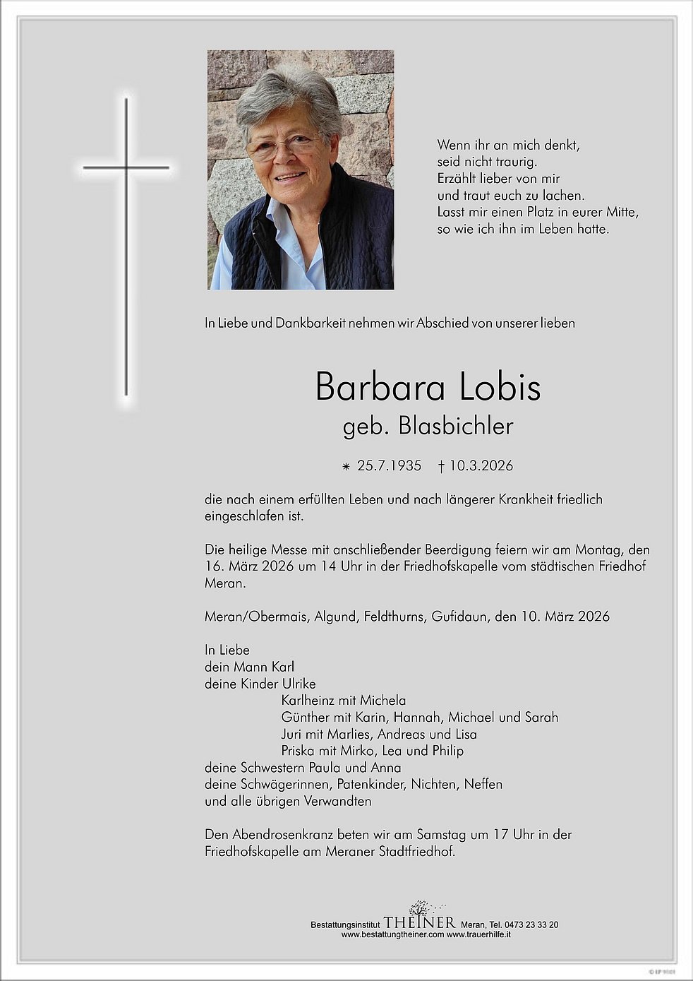 Die heilige Messe mit anschließender Beerdigung feiern wir am Montag, den 16. März 2026 um 14 Uhr in der Friedhofskapelle vom städtischen Friedhof Meran.