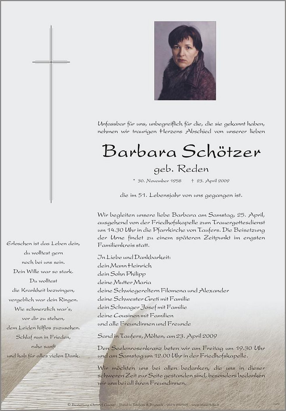 Wir begleiten unsere liebe Barbara am Samstag, 25. April, ausgehend von der Friedhofskapelle zum Trauergottesdienst um 14.30 Uhr in die Pfarrkirche von Taufers. Die Beisetzung der Urne findet zu einem späteren Zeitpunkt im engsten Familienkreis statt.