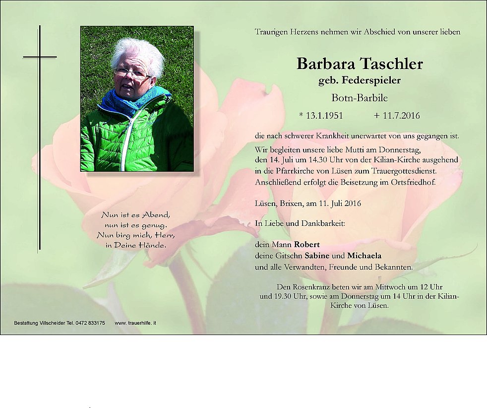 in die Pfarrkirche von Lüsen zum Trauergottesdienst. Anschließend erfolgt die Beisetzung im Ortsfriedhof.