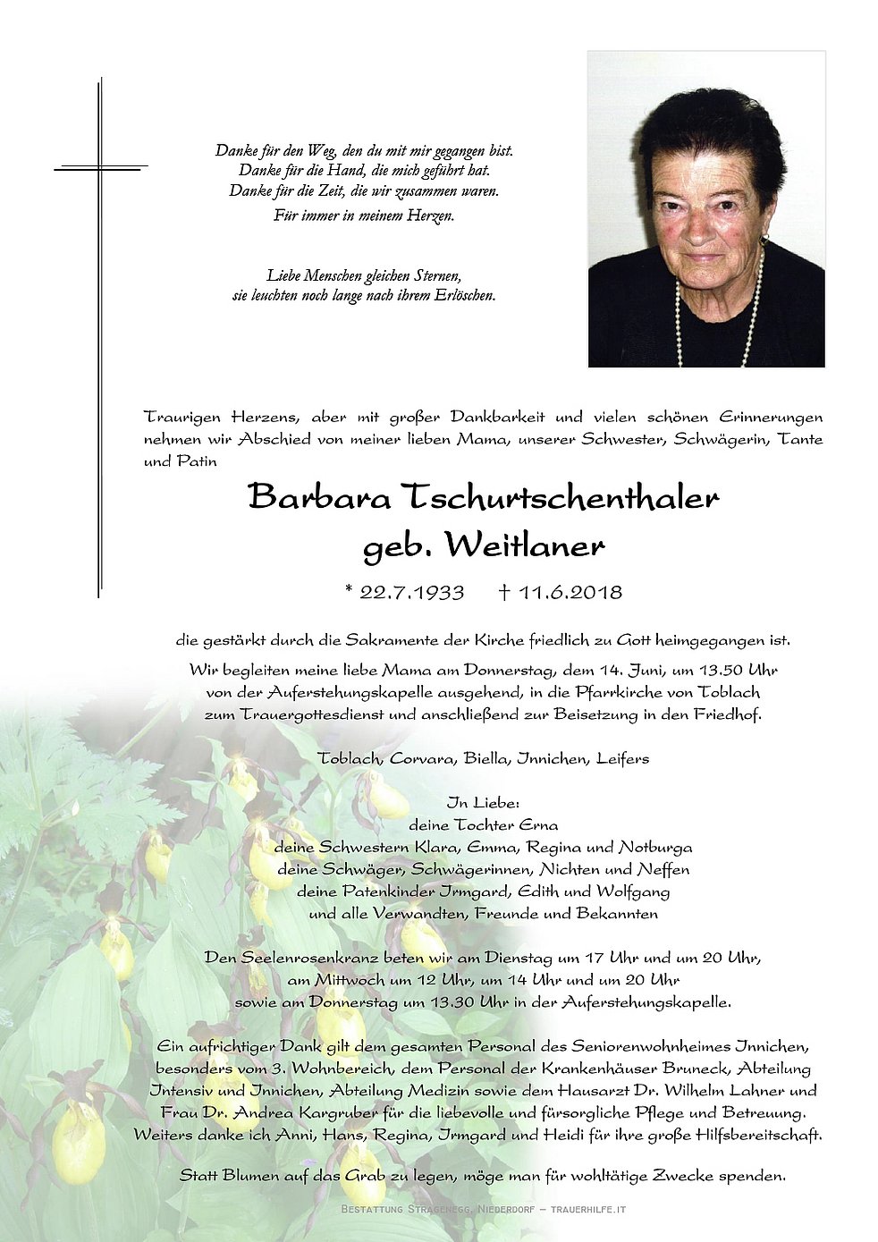 Wir begleiten meine liebe Mama am Donnerstag, dem 14. Juni, um 13.50 Uhr von der Auferstehungskapelle ausgehend, in die Pfarrkirche von Toblach zum Trauergottesdienst und anschließend zur Beisetzung in den Friedhof.