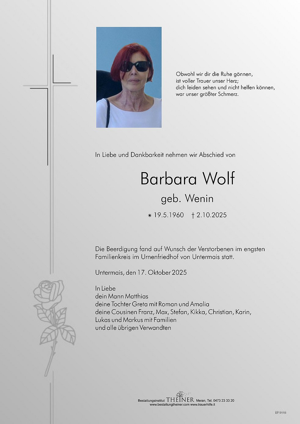 Die Beerdigung fand auf Wunsch der Verstorbenen im engsten Familienkreis im Urnenfriedhof von Untermais statt.