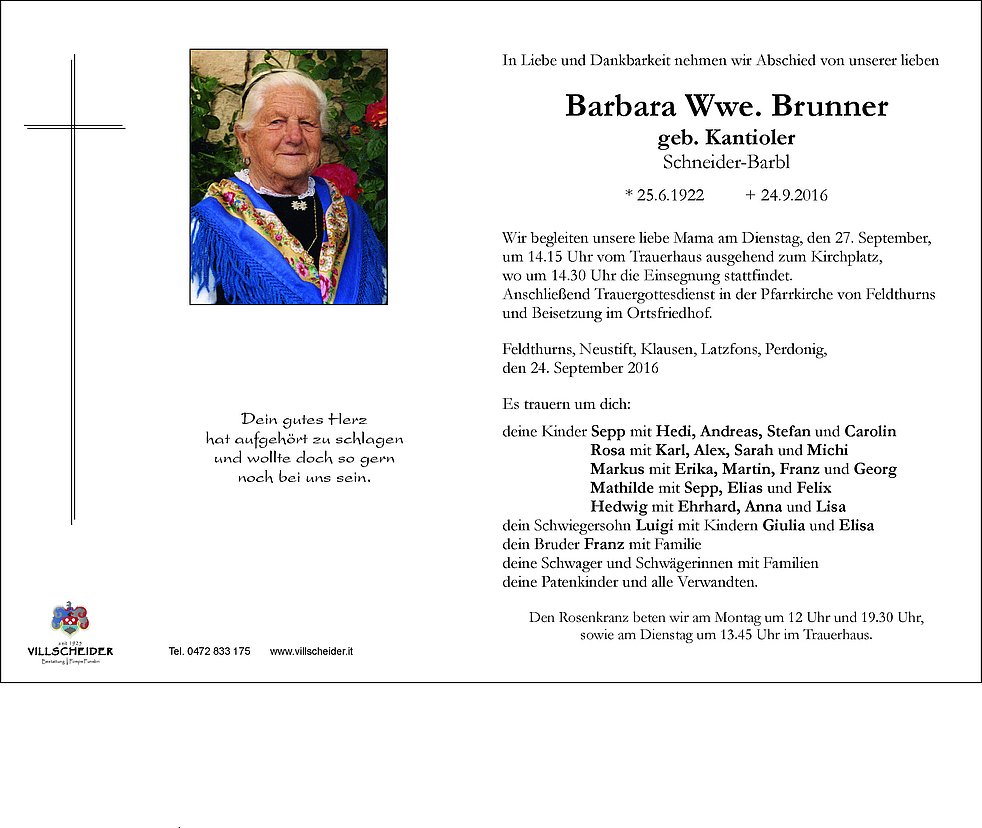Anschließend Trauergottesdienst in der Pfarrkirche von Feldthurns und Beisetzung im Ortsfriedhof.