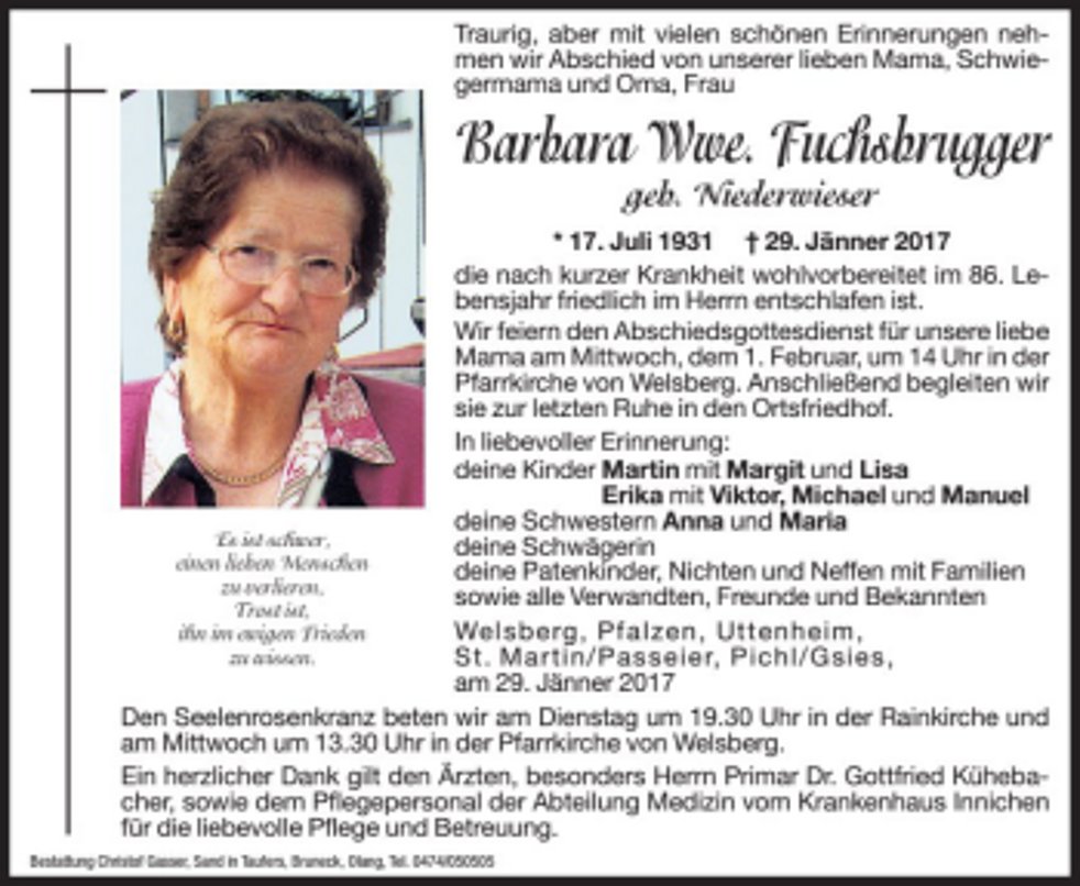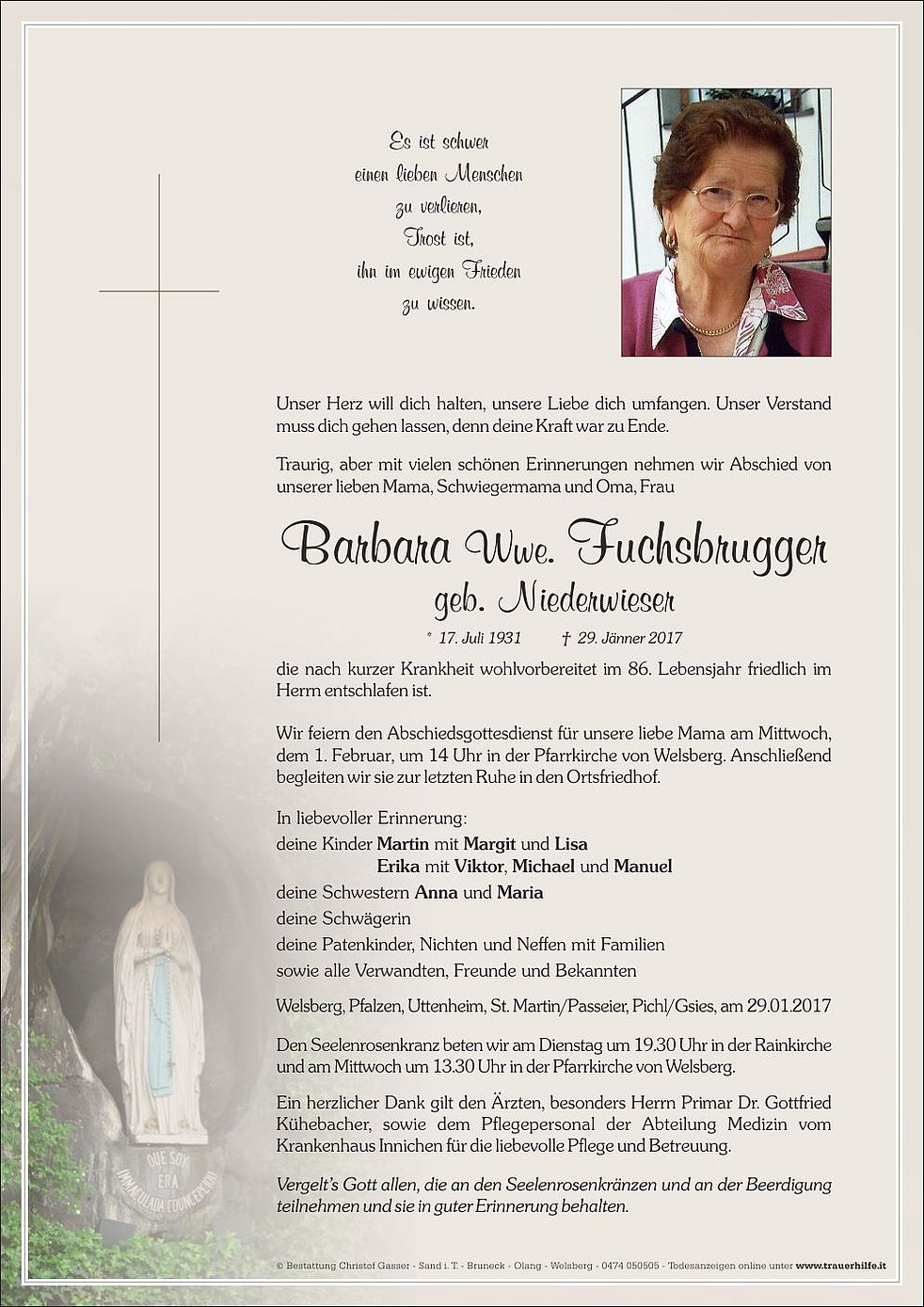 Wir feiern den Abschiedsgottesdienst für unsere liebe Mama am Mittwoch, dem 1. Februar, um 14 Uhr in der Pfarrkirche von Welsberg. Anschließend begleiten wir sie zur letzten Ruhe in den Ortsfriedhof.