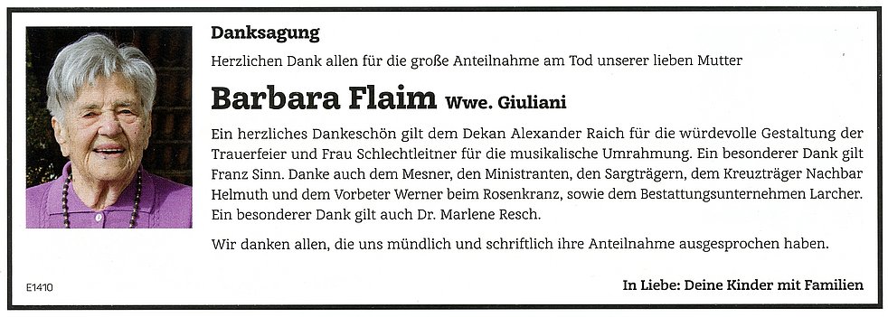 Deine Urenkel Barbara, Andreas, Severin, Romed, Laurenz, Jakob, Anna, Theresa, Moritz, Felix, Kaya, Laura, Fabian und Chiara