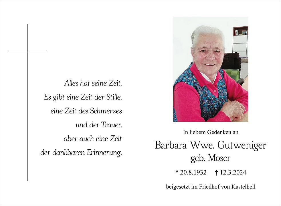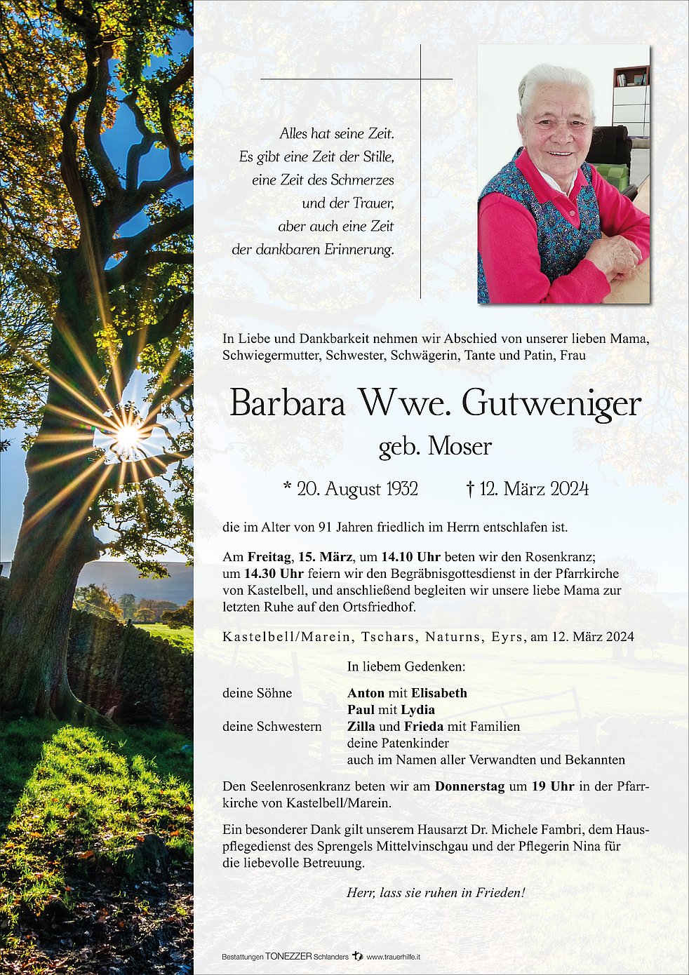 Am Freitag, 15. März, um 14.10 Uhr beten wir den Rosenkranz; um 14.30 Uhr feiern wir den Begräbnisgottesdienst in der Pfarrkirche von Kastelbell, und anschließend begleiten wir unsere liebe Mama zur letzten Ruhe auf den Ortsfriedhof.