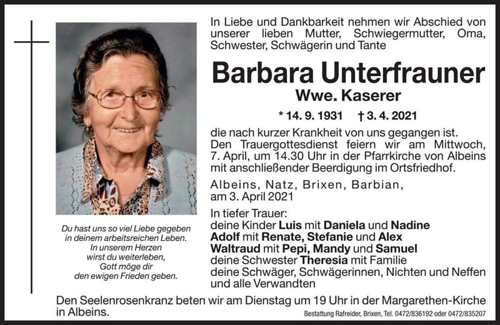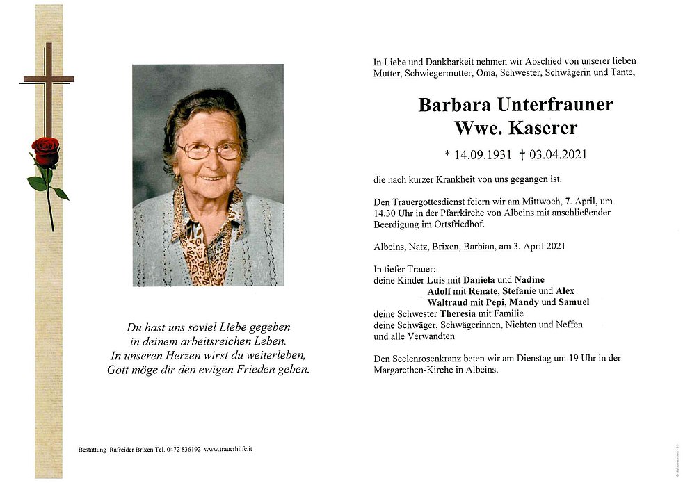 Den Trauergottesdienst feiern wir am Mittwoch, 7. April, um 14.30 Uhr in der Pfarrkirche von Albeins mit anschließender Beerdigung im Ortsfriedhof.