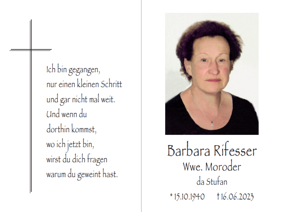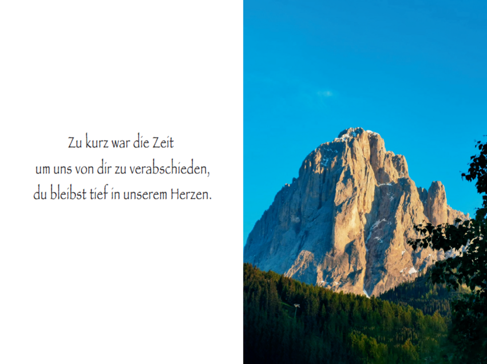 Ein besonderer Dank gilt der Hausärztin Cordula Weber, dem Pflegepersonal des Altersheims San Durich, den Ersthelfern und der Intensivstation des Krankenhauses Bozen für die liebevolle Betreuung.
