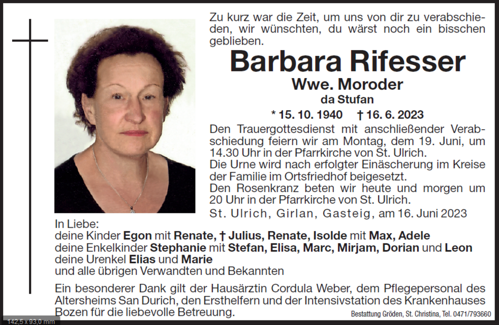 Den Trauergottesdienst mit anschließender Verabschiedung feiern wir am Montag, dem 19. Juni, um 14.30 Uhr in der Pfarrkirche von St. Ulrich.