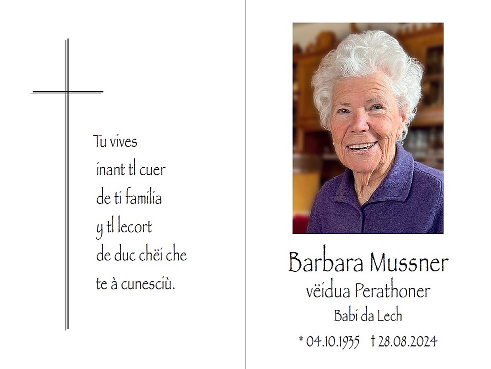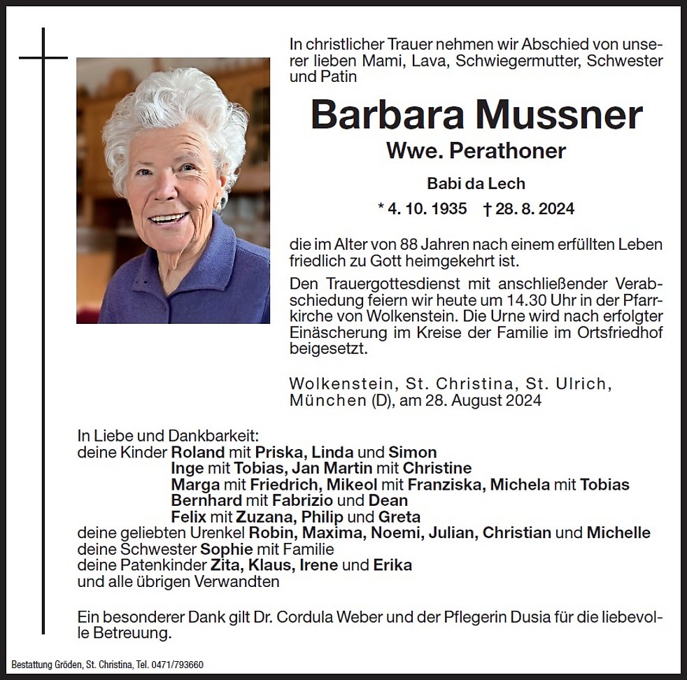 Den Trauergottesdienst mit anschließender Verabschiedung feiern wir am Donnerstag, dem 29. August, um 14.30 Uhr in der Pfarrkirche von Wolkenstein. Die Urne wird nach erfolgter Einäscherung im Kreise der Familie im Ortsfriedhof beigesetzt.