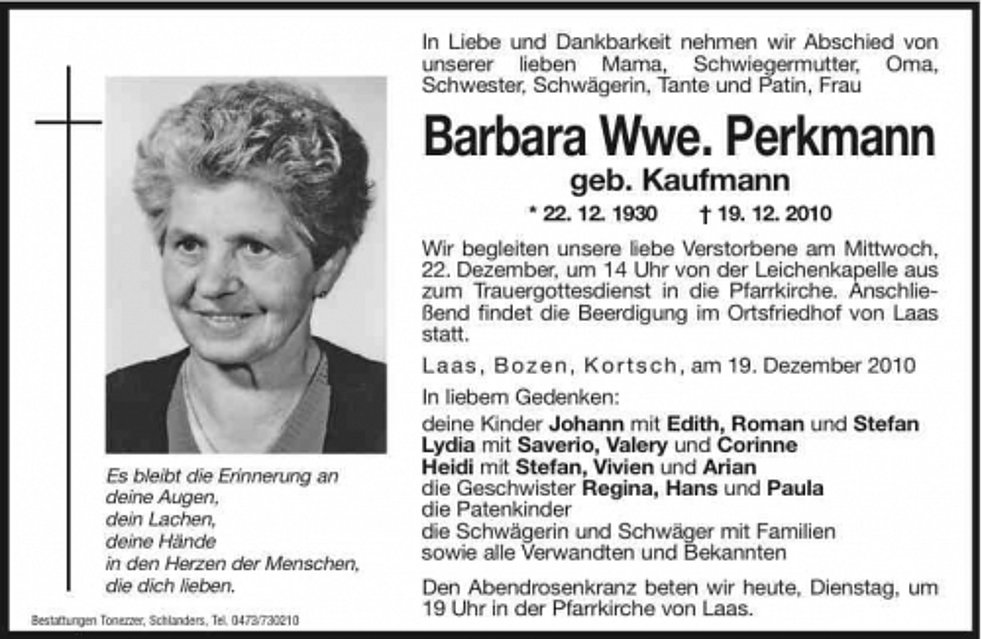Wir begleiten unsere liebe Verstorbene am Mittwoch, 22. Dezember, um 14 Uhr von der Leichenkapelle aus zum Trauergottesdienst in die Pfarrkirche. Anschließend findet die Beerdigung im Ortsfriedhof von Laas statt.