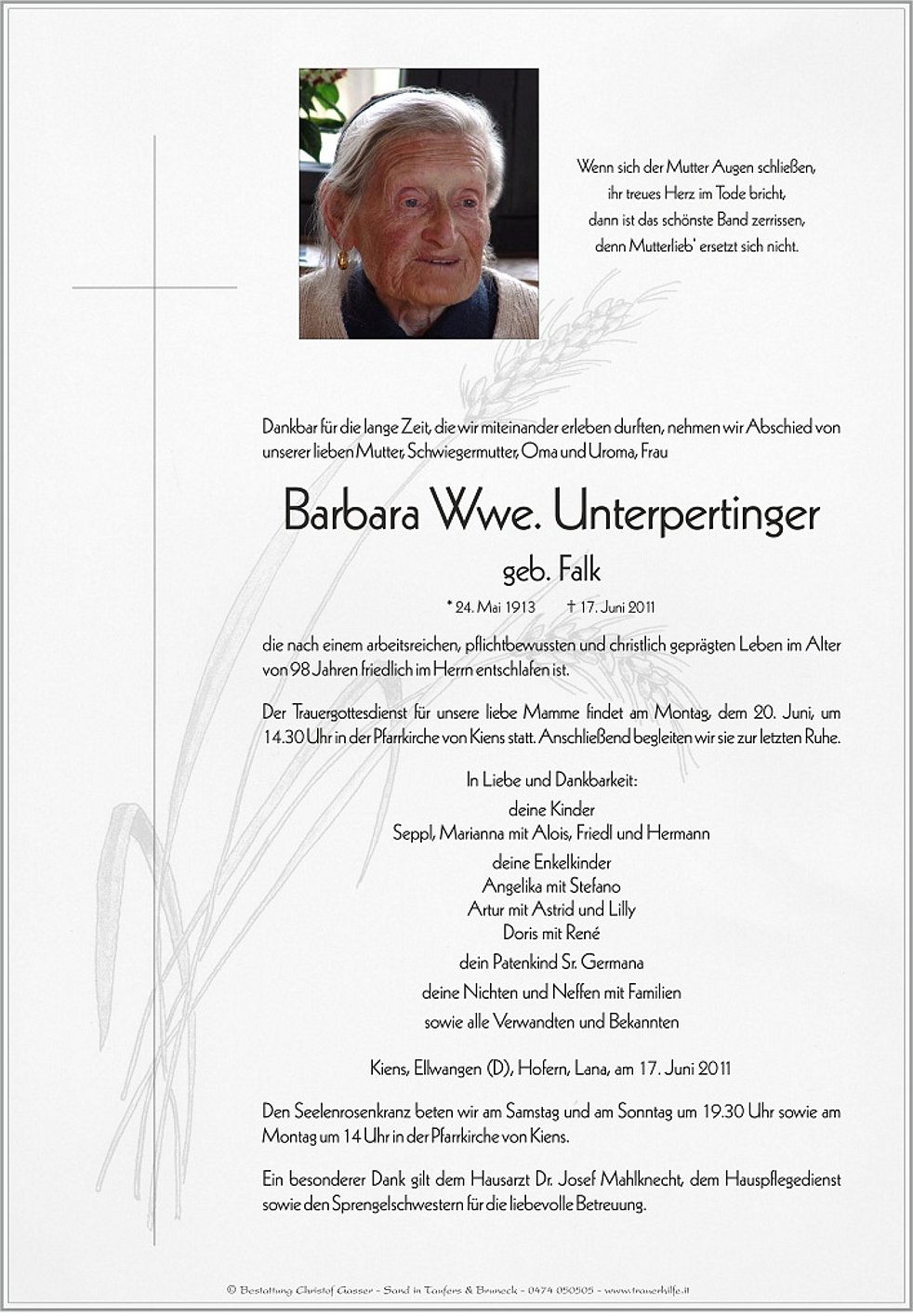 Ein besonderer Dank gilt dem Hausarzt Dr. Josef Mahlknecht, dem Hauspflegedienst sowie den Sprengelschwestern für die liebevolle Betreuung.
