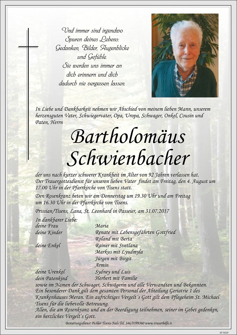 Ein besonderer Dank gilt dem gesamten Personal der Abteilung Geriatrie 1 des Krankenhauses Meran. Ein aufrichtiges Vergelt´s Gott gilt dem Pflegeheim St. Michael Tisens für die liebevolle Betreuung. Allen, die am Rosenkranz und an der Beerdigung teilnehmen, seiner im Gebet gedenken, ein herzliches Vergelt`s Gott.