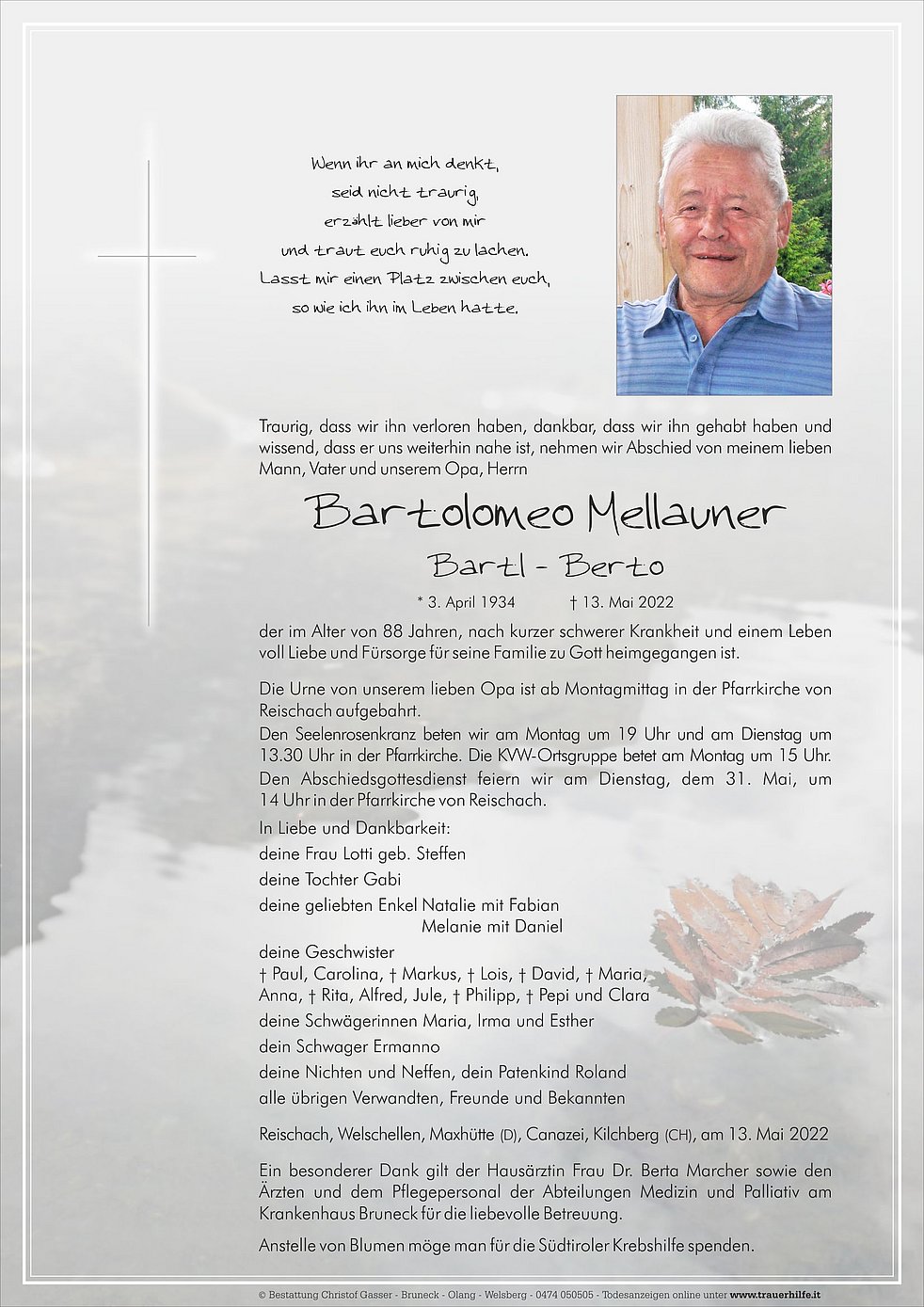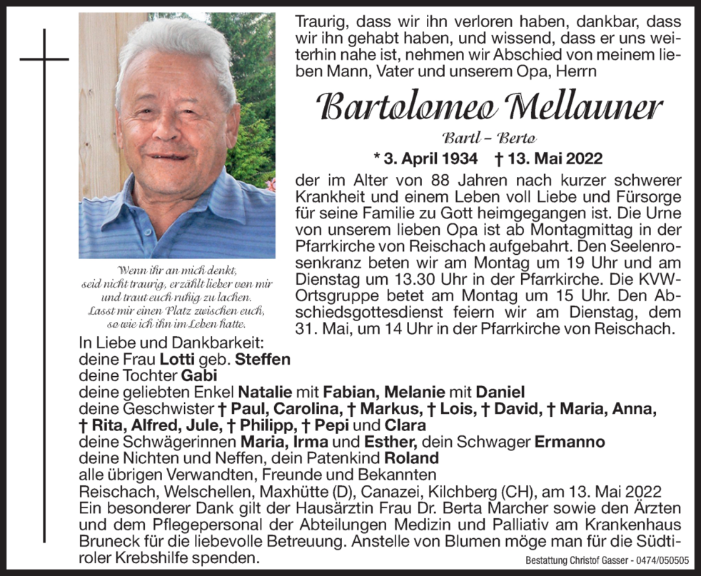 Anstelle von Blumen möge man für die Südtiroler Krebshilfe spenden.