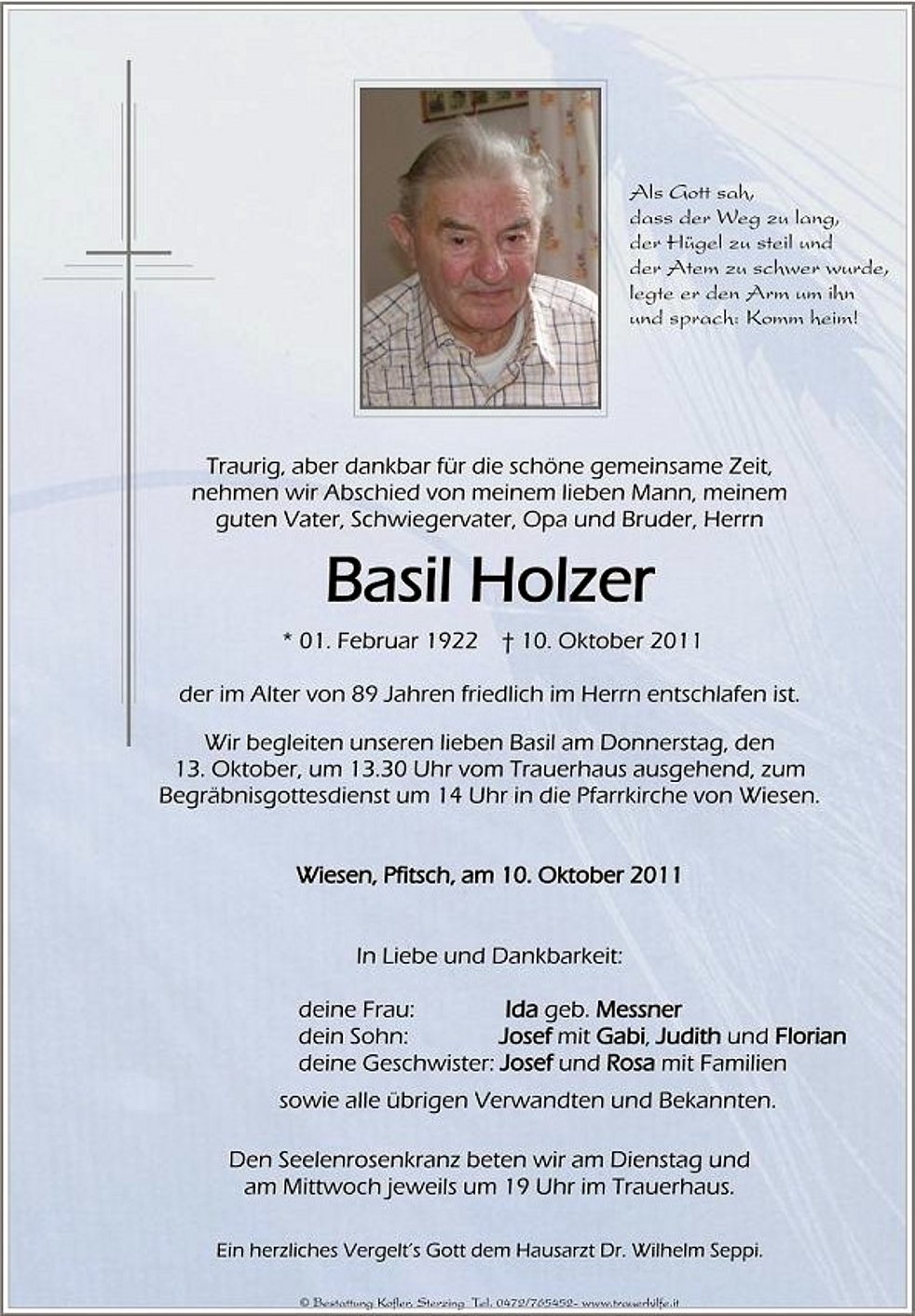 Wir begleiten unseren lieben Basil am Donnerstag, den 13. Oktober, um 13.30 Uhr vom Trauerhaus ausgehend, zum Begräbnisgottesdienst um 14 Uhr in die Pfarrkirche von Wiesen.
