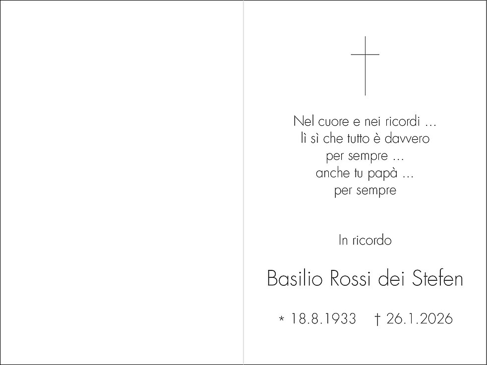 La S. Messa in suffragio verrà celebrata venerdì 30 gennaio alle ore 14.00 nell’abside della chiesa di San Domenico, piazza Domenicani a Bolzano, seguirà la cremazione.