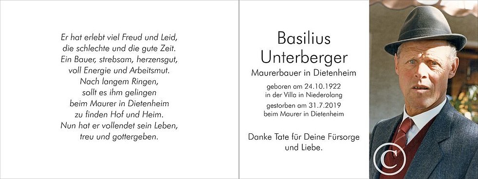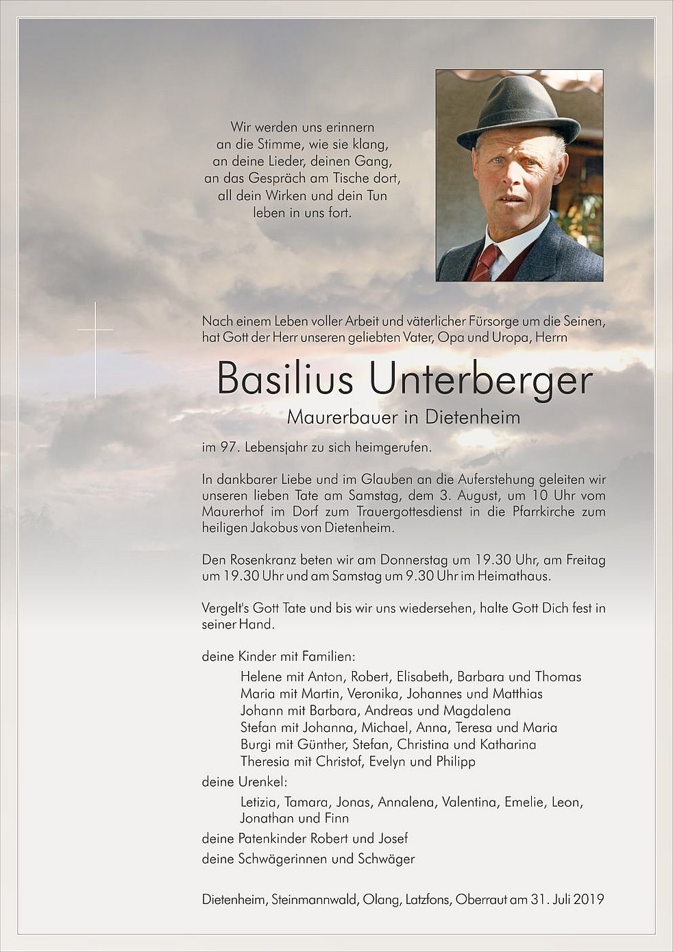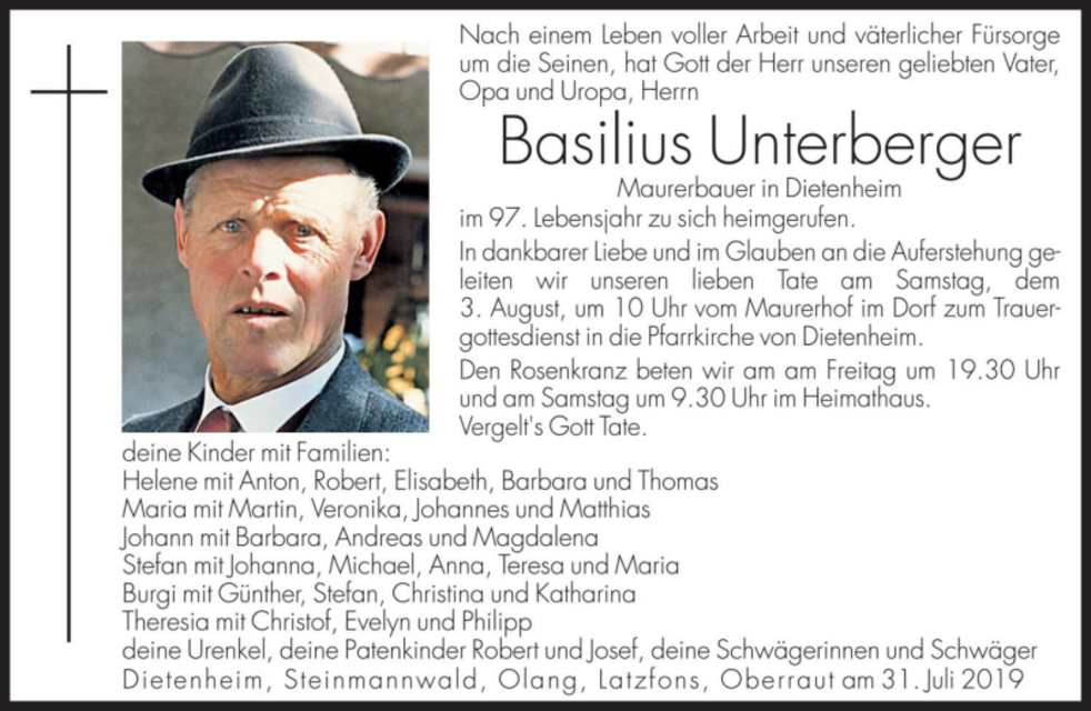 In dankbarer Liebe und im Glauben an die Auferstehung geleiten wir unseren lieben Tate am Samstag, dem 3. August, um 10 Uhr vom Maurerhof im Dorf zum Trauergottesdienst in die Pfarrkirche zum heiligen Jakobus von Dietenheim.