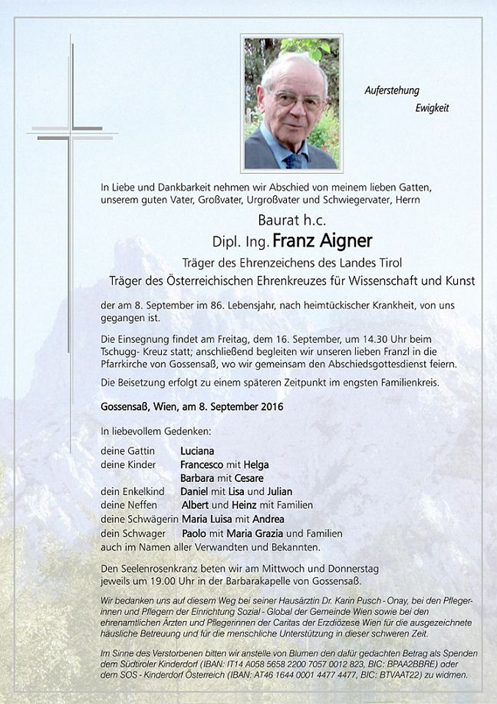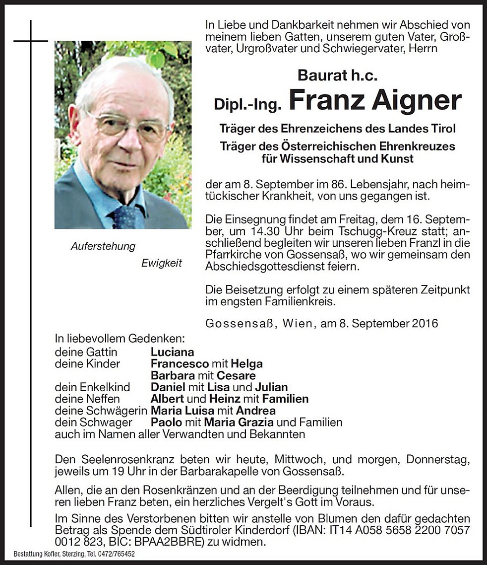 Im Sinne des Verstorbenen bitten wir anstelle von Blumen den dafür gedachten Betrag als Spenden dem Südtiroler Kinderdorf ( IBAN: IT14 A058 5658 2200 7057 0012 823, BIC: BPAA2BBRE ) oder dem SOS - Kinderdorf Österreich ( IBAN: AT46 1644 0001 4477 4477, BIC: BTVAAT22 ) zu widmen.