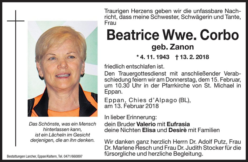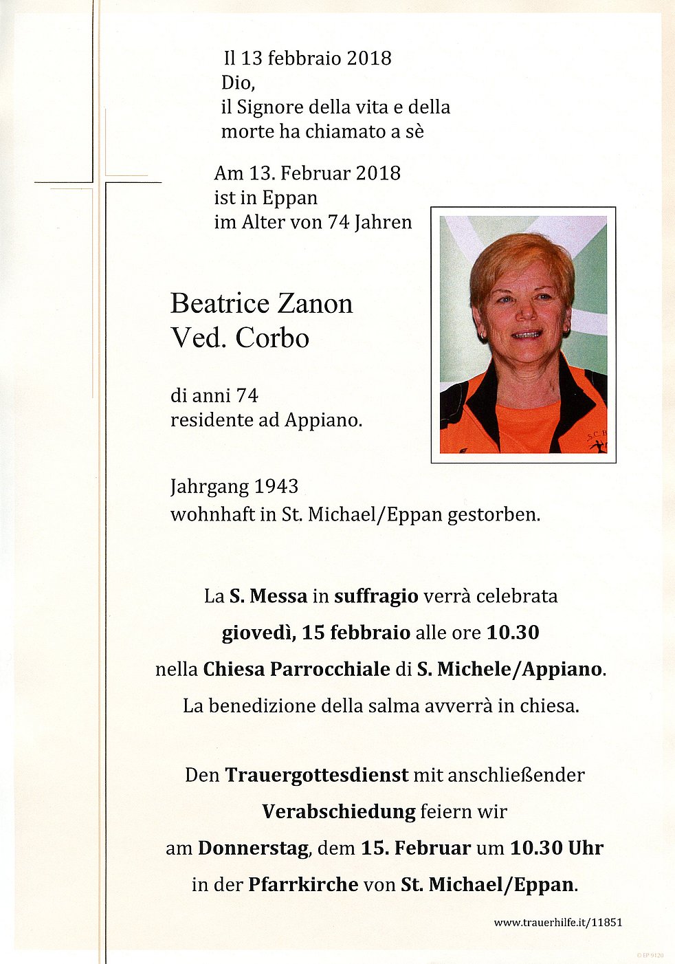 Den Trauergottesdienst mit anschließender Verabschiedung feiern wir am Donnerstag, dem 15. Februar um 10.30 Uhr in der Pfarrkirche von St. Michael/Eppan.